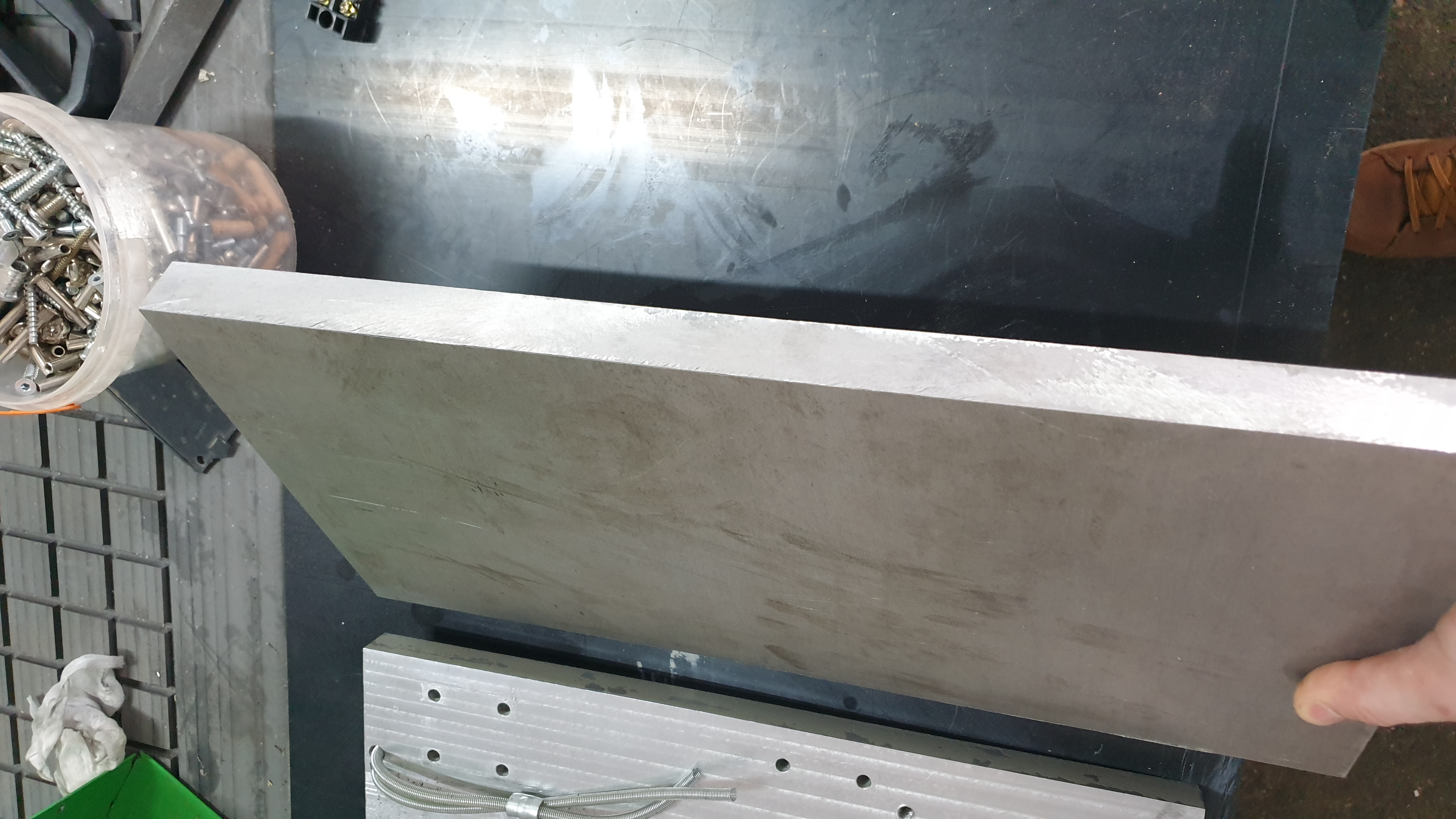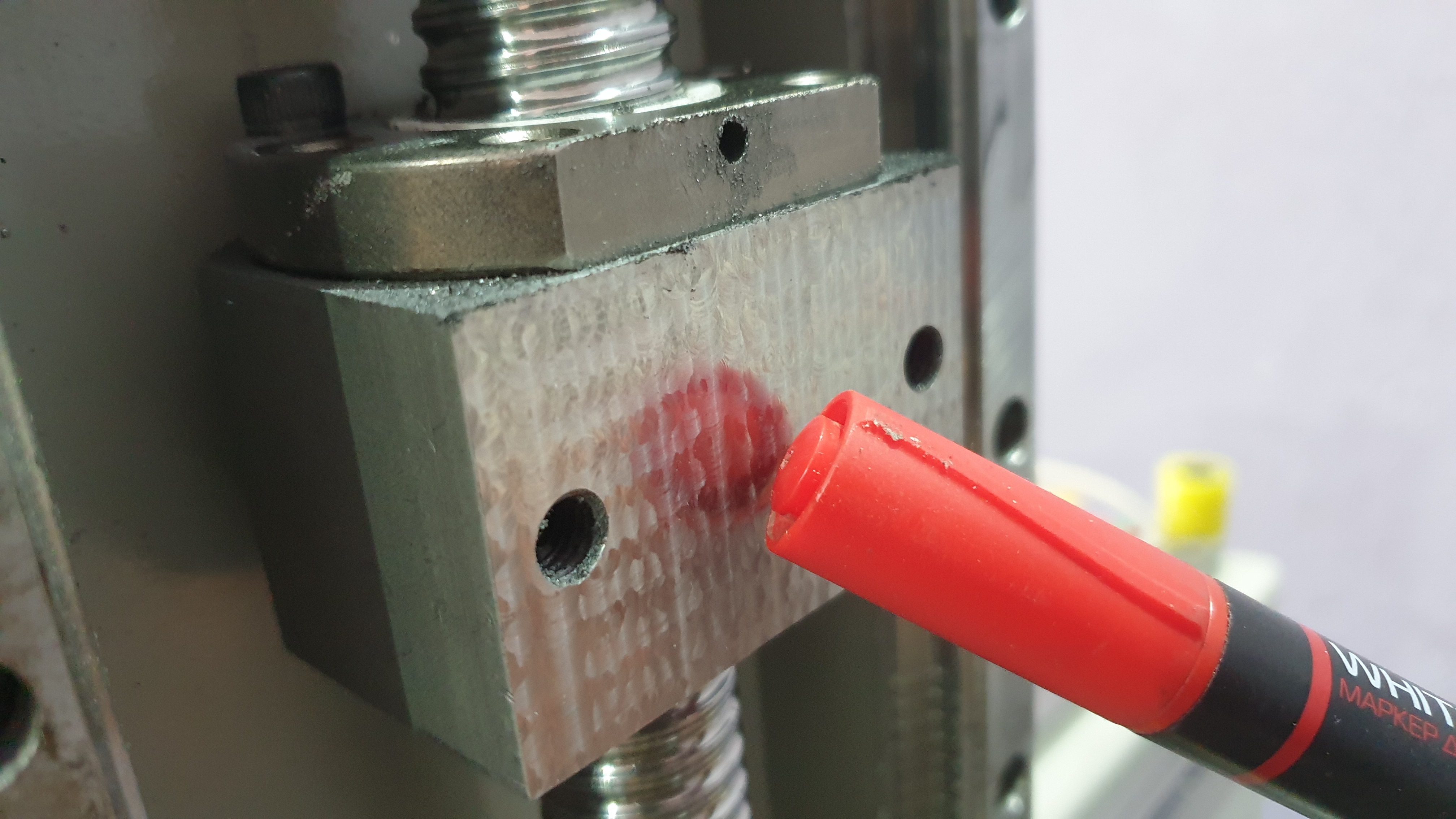 Крепление гайки швп кривое. Подправили, пока не понятно удачно или нет, но надежда есть) Оно стальное, кстати. Плита оси z вся в раковинах, как швейцарский сыр, при затяжке проминается. И толщина всего 18 мм при том, что это просто смесь алюминиевого лома, судя по всему... Решено заменить на новую. В95Т плиту заказали 24 мм. Посмотрим сколько выйдет после обдирки.