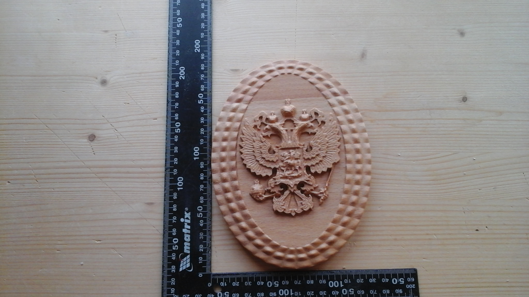 Вот еще один продукт! Модель составлена из разных STL моделей с помощью Арткама, вырезана на буке и обработана маслом. Угольная линейка приложена для оценки общих размеров резной картины.