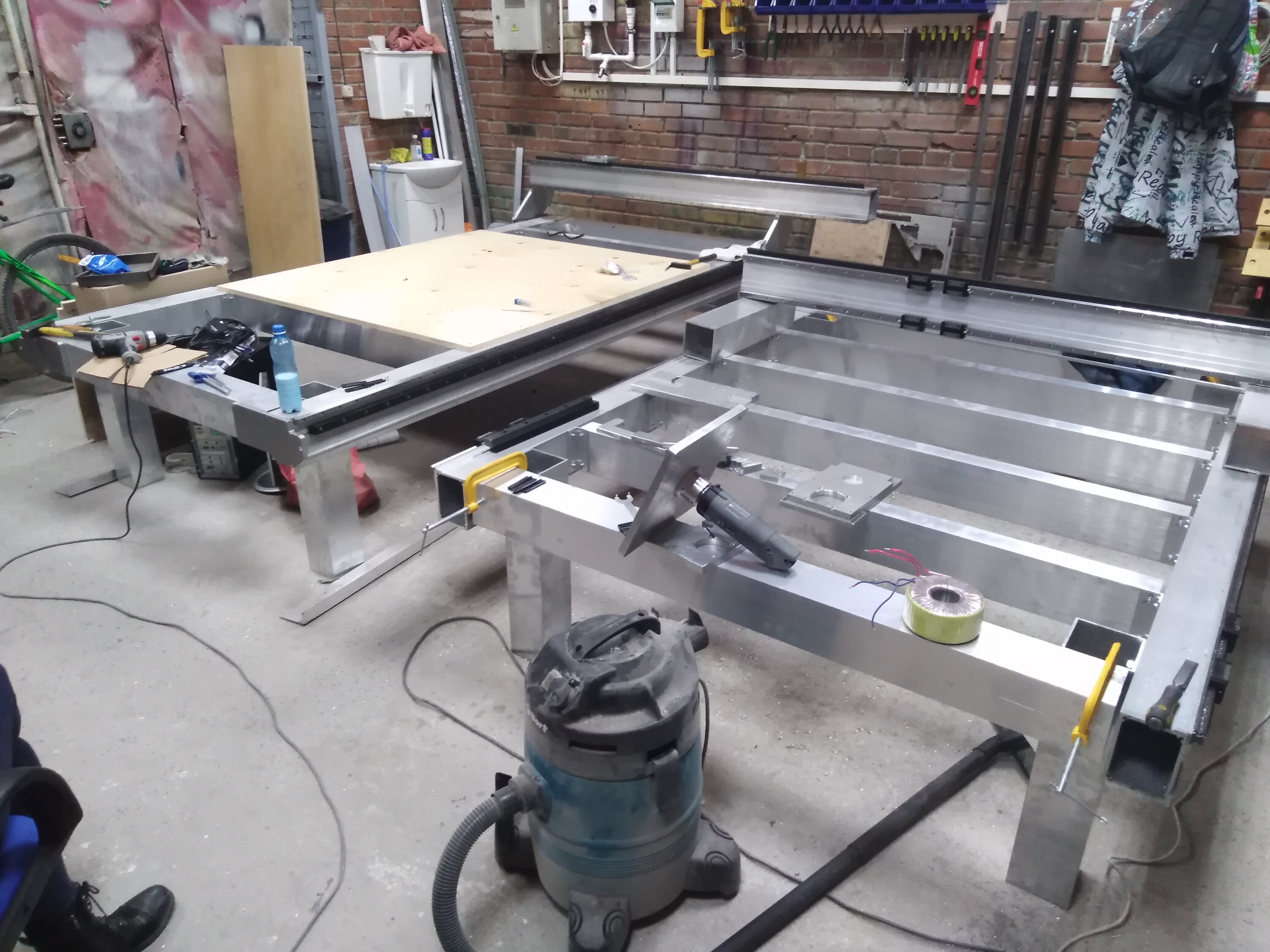 Отличительной особенностью данного станка является "провал" в начале рабочего стола. Он нужен для фрезеровки высоких деталей. Провал позволяет не делать высоких боковин портала, что должно положительно сказаться на жесткости. Также для жесткости, ось Z выполнена по схеме "обратка". Плита крепления шпинделя из аркообразного профиля.