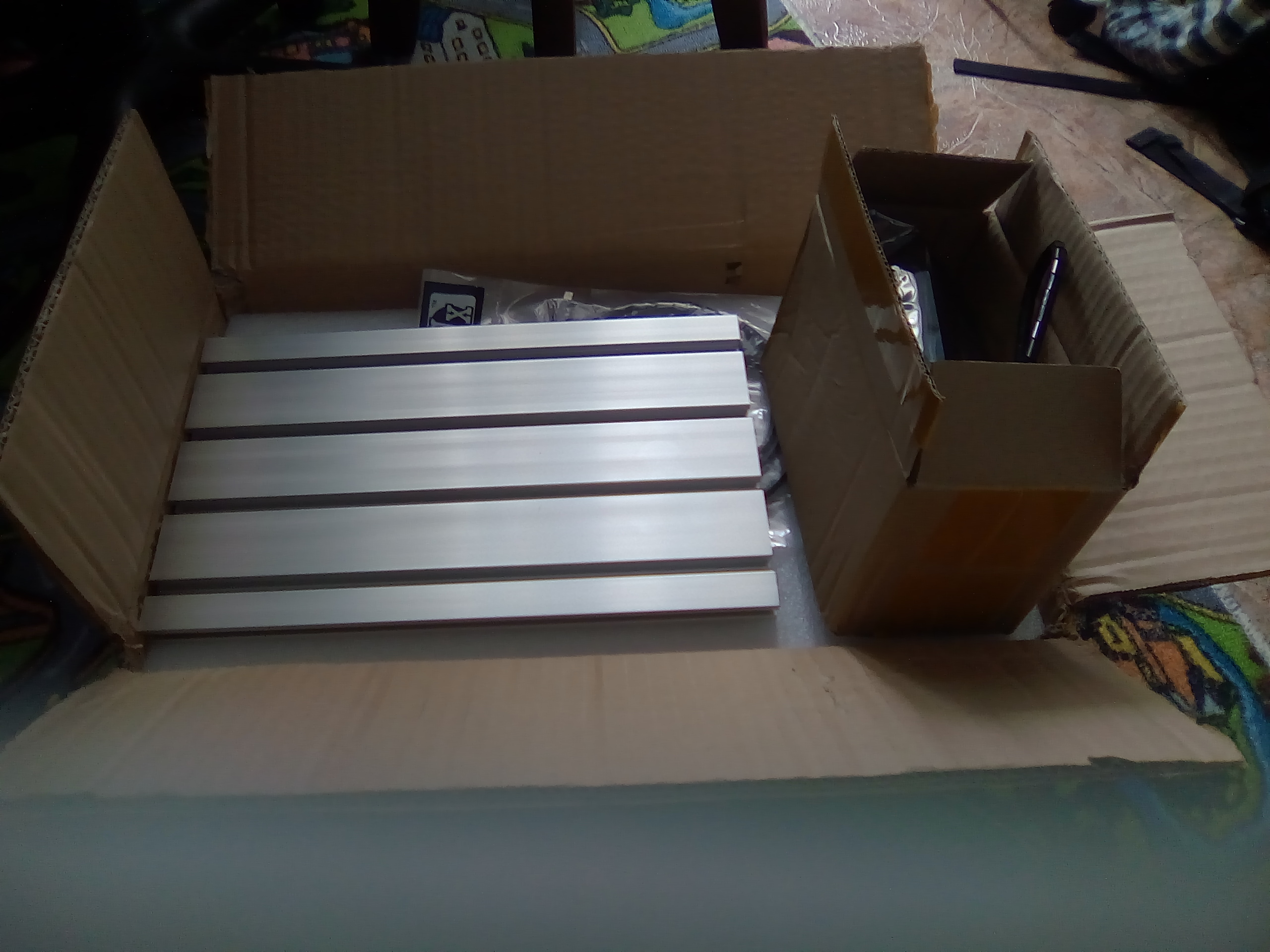 Заказал на али через мобильное приложение в комплекте с лазером 5.5 Вт. Посылка (большой полиэтиленовый мешок) вмещала короб запчастей и коробочку с лазером:
