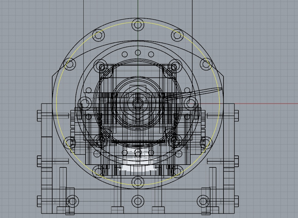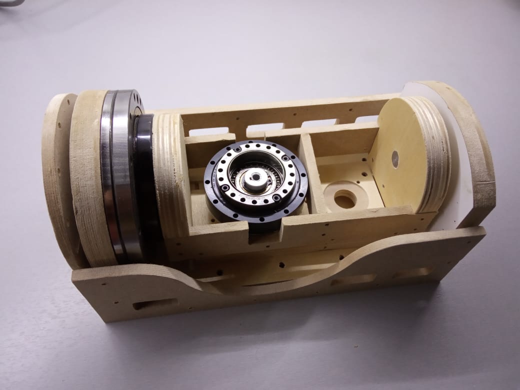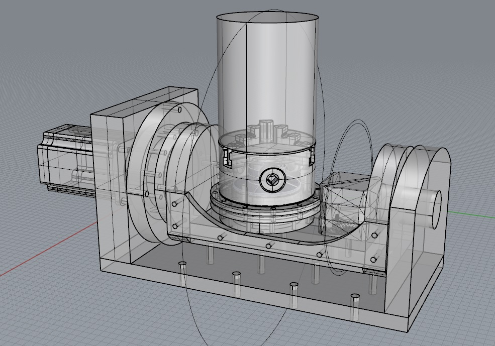 Внутри мелкая гармонь, её переходник и 80мм патрон (моя сегодняшняя 4я ось). Мотор... перерисую на 23й, но пока с переходником на 17й. Нет 23го. Пока закажу, пока приедет.. 17й постоит. Скорости мне не нужны. Связь мотора с гармошкой ремнём. Пока GT2, но закажу пошире.