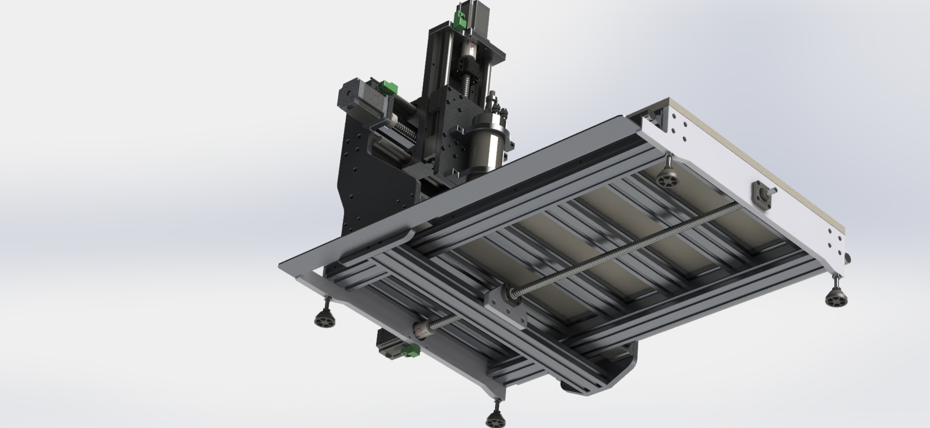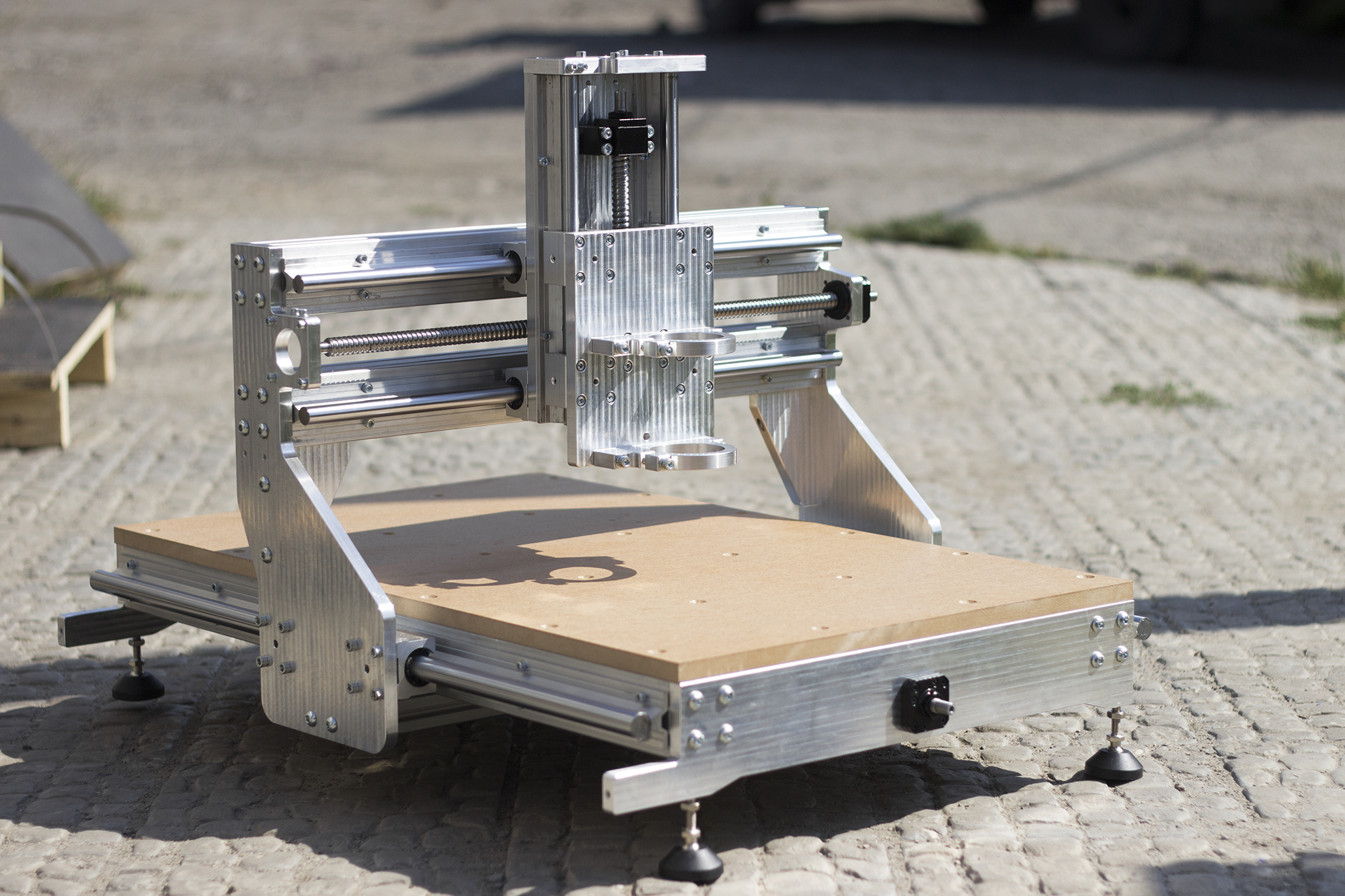 Станочек с рабочим полем 400х600 мм на направляющих SBR для работы по дереву, и установку шпинделя 800 вт, 65 мм диаметром. В основе - конструкционный профиль 60х60 и 60х30, фрезерованные детали из плиты 14 мм.
