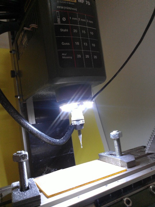 Так-же при работе не хватает света, поэтому пришлось добавить подсветку: Вес станочку придает станина, к которой прикручена стойка: На данной стойке есть удобная линейка, которую можно передвигать на всем протяжении: Рабочий стол прикручивается к станине: 4-мя шестигранными винтами, и по оси X есть так-же линейка, которую можно двигать на всем протяжении.