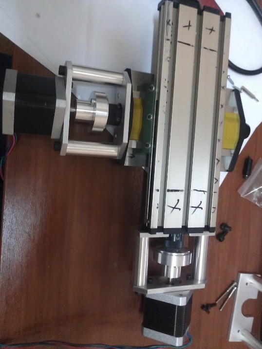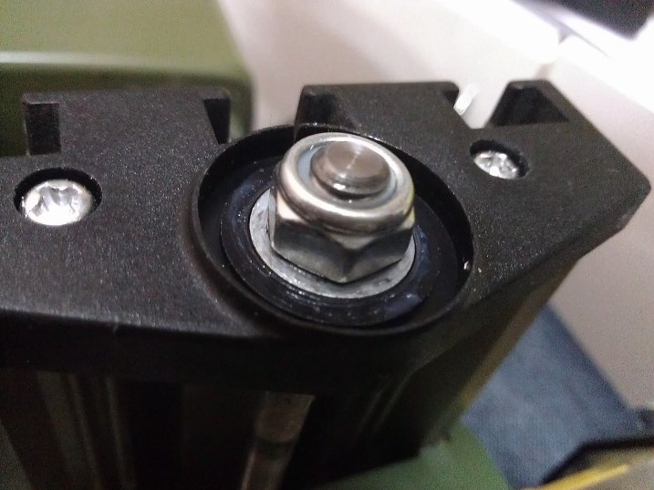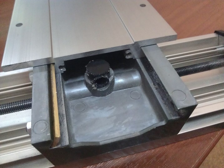 Желтыми крышками винт передвижения стола по оси Y закрывается от мусора, но очень мелкий мусор все равно попадает туда, люфт по обоим осям регулируется с помощью 6 шестигранных болтиков с фиксирующими гайками, но со временем все рано люфт начинает появляться, и самое сложное это найти баланс между тем как затянуть эти болты, и легкостью верчения ручек для перемещения стола. По оси X для перемещения стола полностью с одной стороны в другую необходимо выполнить 200 вращений, и туго затянутые болты эту процедуру усложняют. А так-же с противоположной стороны от ручек вращения мы имеем следующее: что тоже очень влияет на легкость вращения.