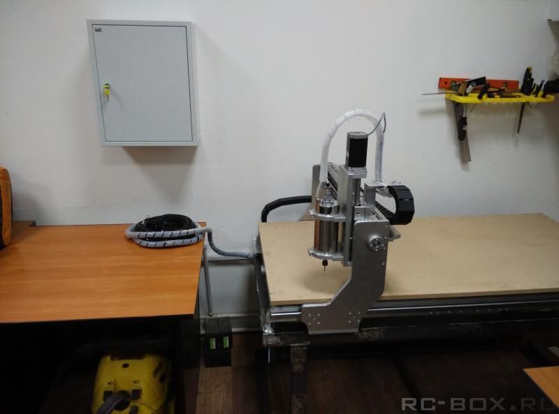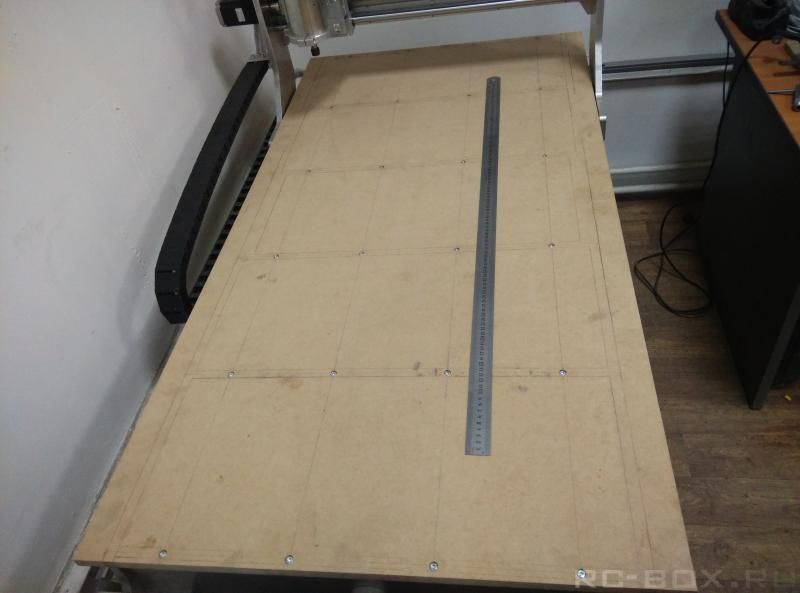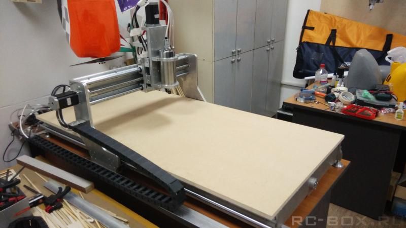 Для рабочего стола решил использовать МДФ плиту 16мм. Алюминиевый стол таких размеров никак не вписывал в бюджет... Также между делом были прокинуты все провода по станку.