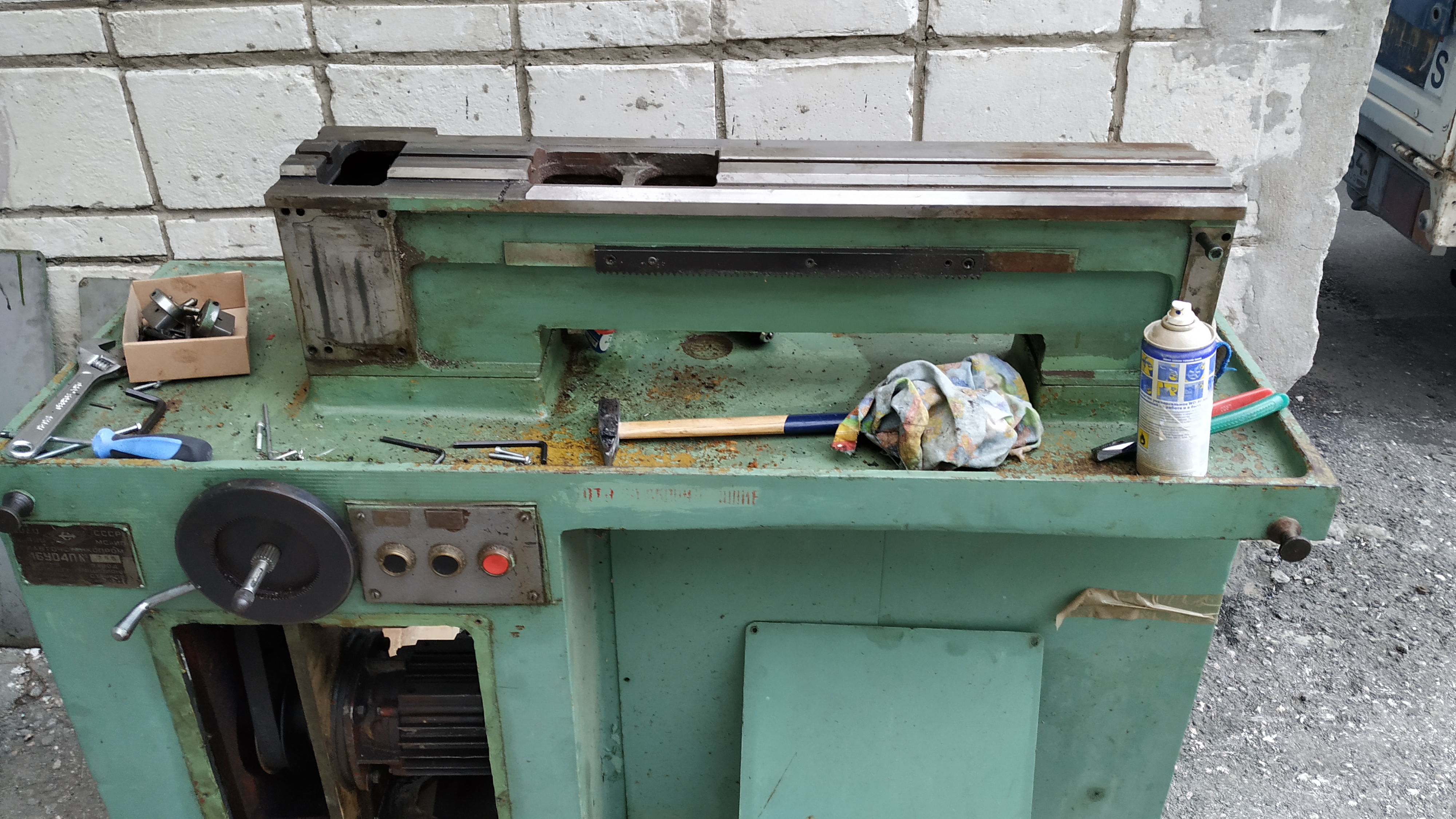 Станок 2 года простоял на улице закрытый брезентом. Немного в масле. Несмотря на ржавчину все крутиться-вертиться плавно без заеданий.
