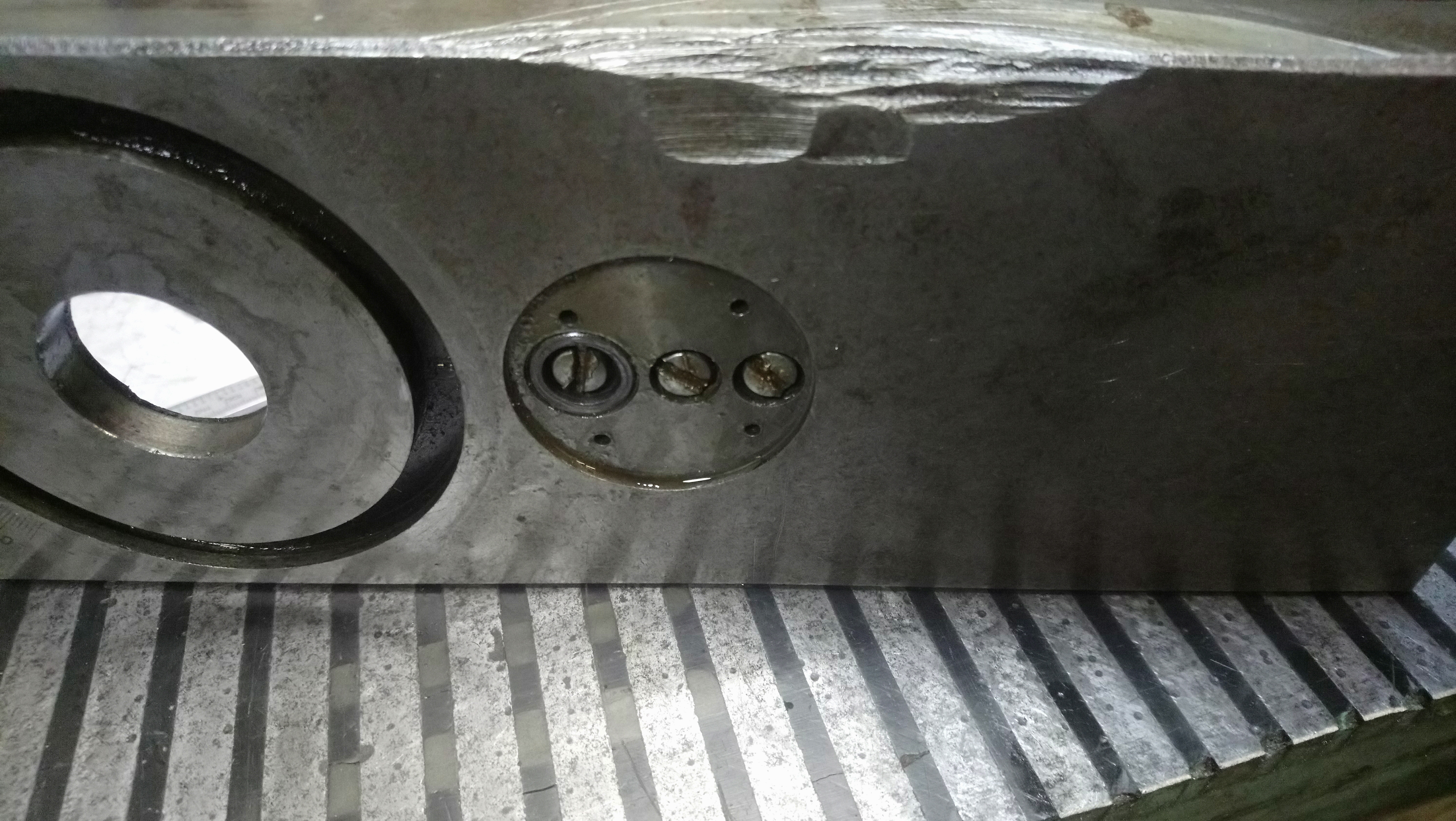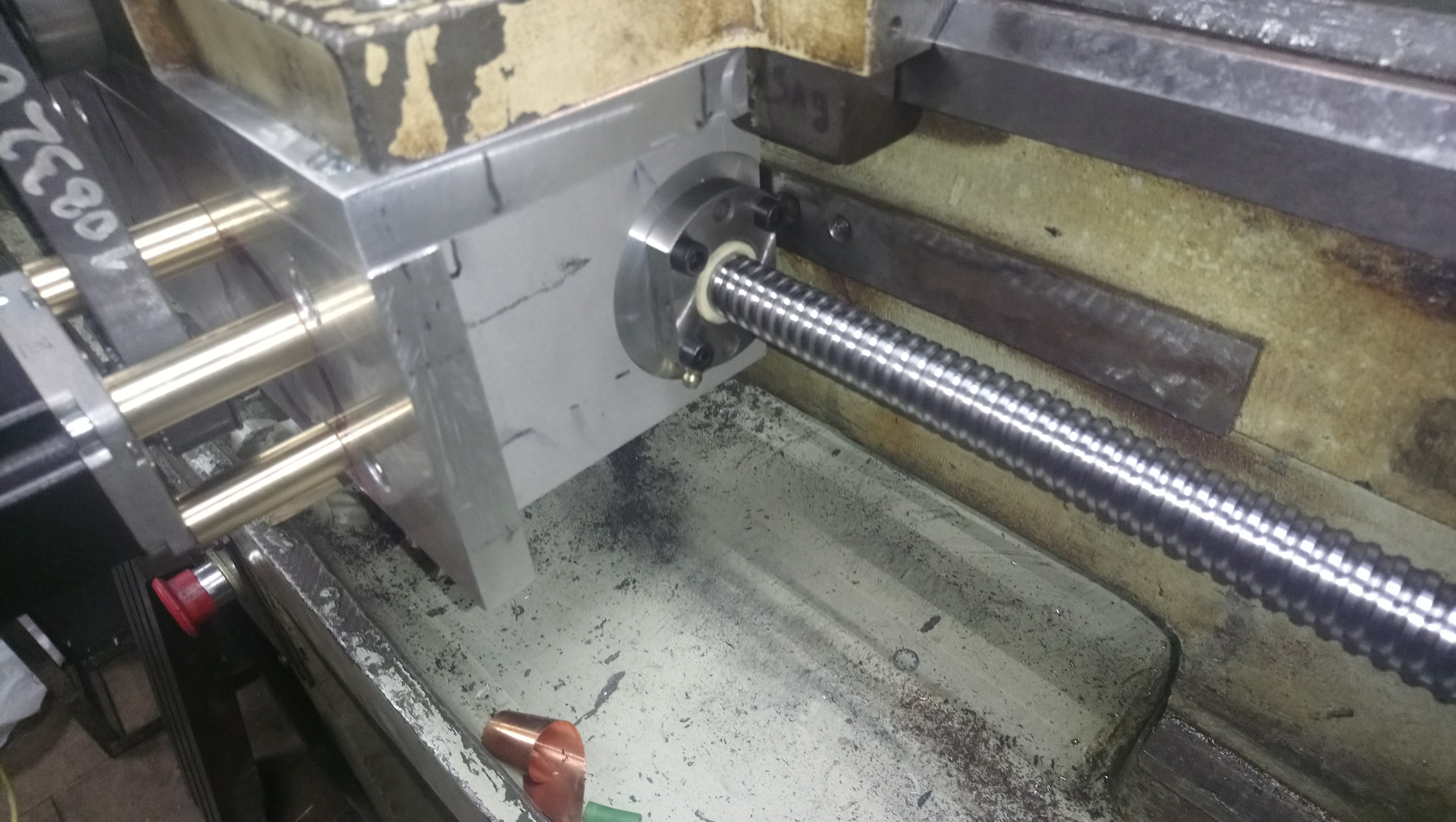 Не понравилось точить на изношенном трап винте поперечки, заменил на швп 1605 L600. Так как условие быстрота решения и минимум изменений в станке, пришлось поступить нагло. Пара блинов, немного измерений и три новых отверстия в салазках решили проблему установки ШВП. Ну и шаберком помахал на сопрягаемых плоскостях. Лимиты поперечки - трубка не магнитной нержи + стальной шарик + два индуктивных концевика и магнит на салазках = герметично, быстро, работает.
