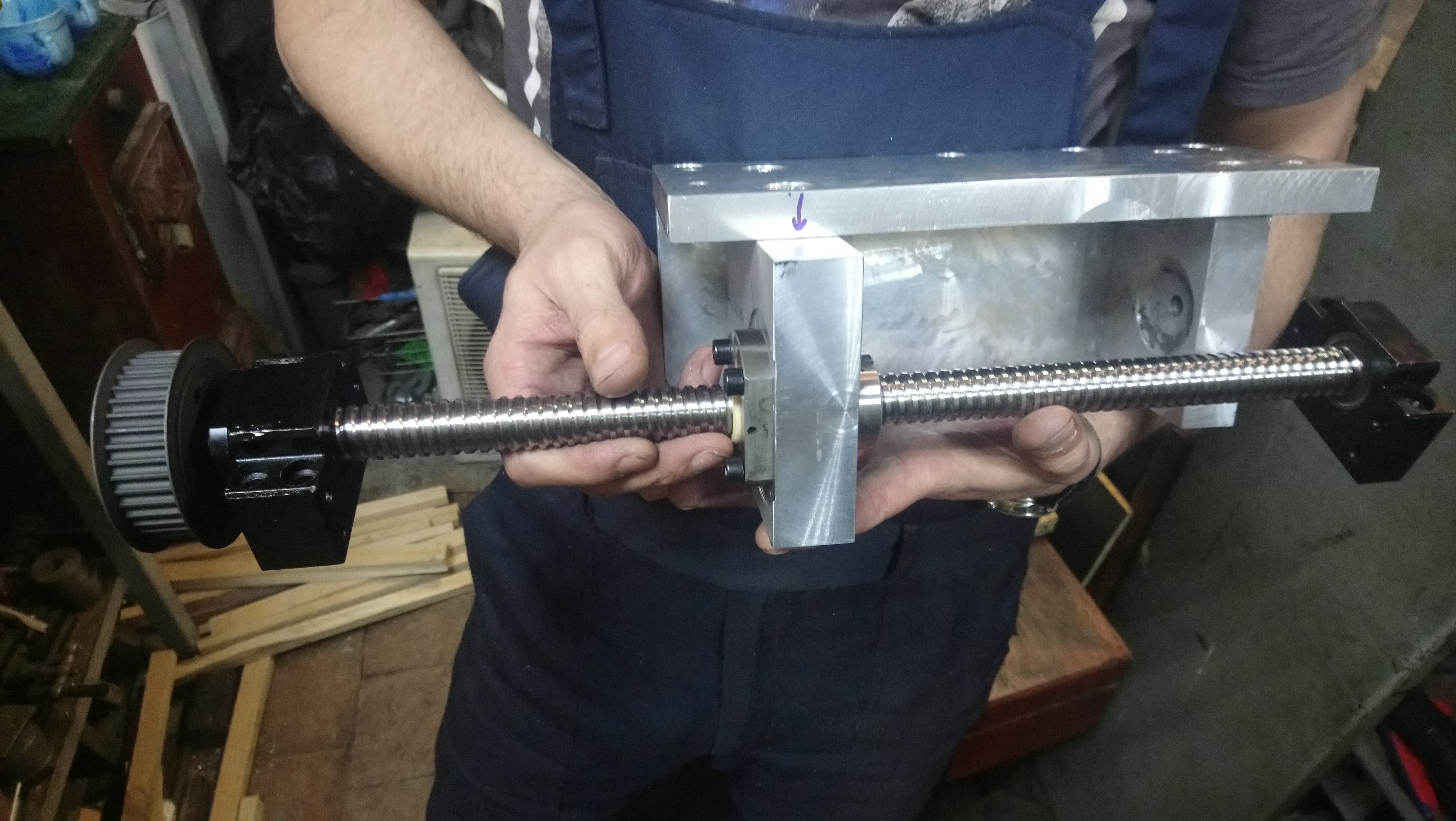 Вот, что в итоге получилось: Далее начался процесс сборки "Лжефартука" со всего что было под рукой. Без помощи фрезерного оказалось очень не просто, но и тут нашлась лазейка - сверлилка, напильник и шабер. Как итог - все плиты подогнаны и имеют большое пятно контакта, а также параллельность и перпендикулярность. На токарном проточил посадку под гайку ШВП, относительно нее уже пришабрил опорную плоскость к плите. На счет используемых передач: ремни HTD5 15мм, редукция 1:2 на двух осях.