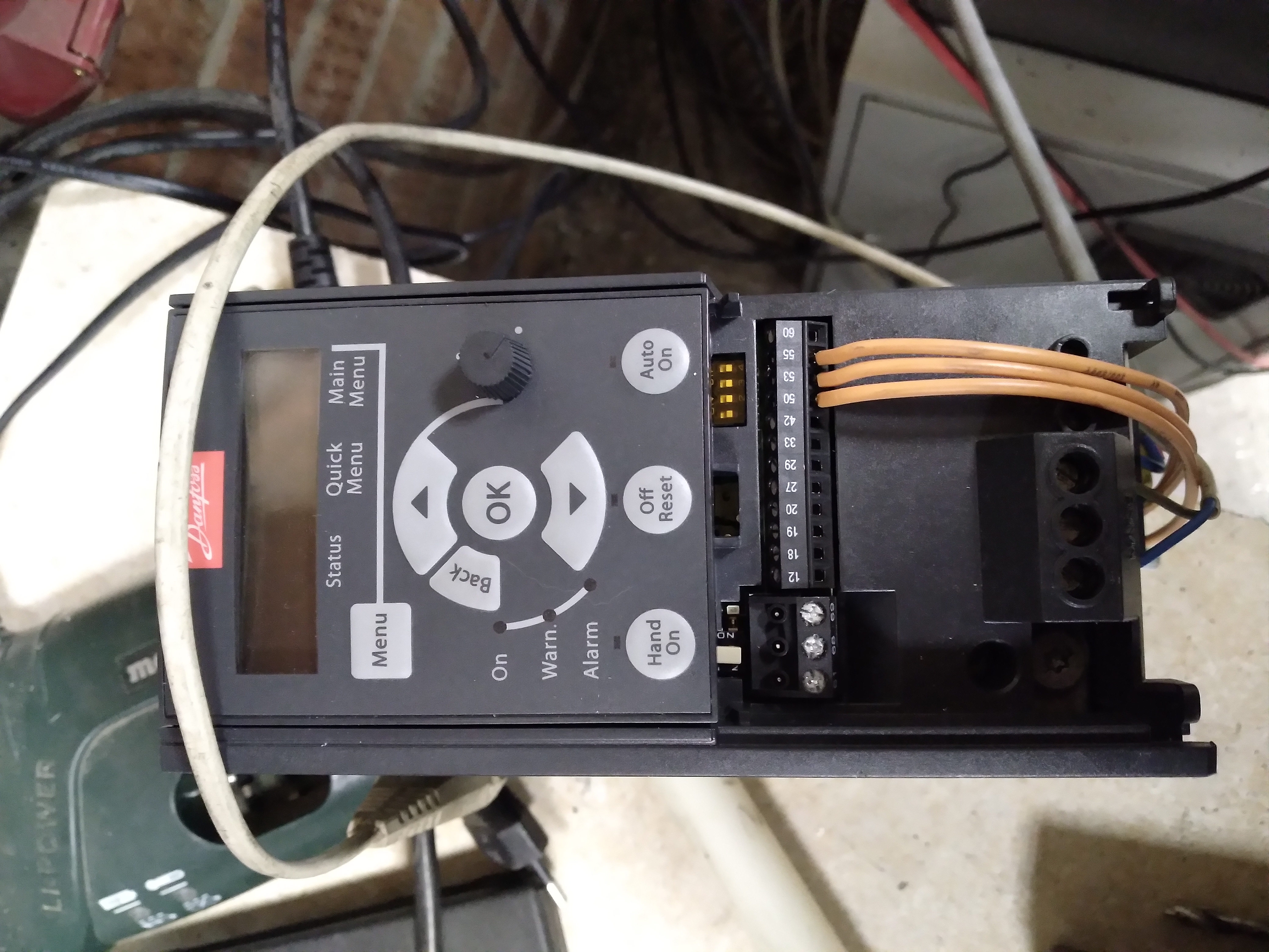 С данфосом разобрался. Мало того что он не хотел стартовать с 4гц так у него ещё и обороты плавали. В плавающих оборотах оказался виноват неисправный переменник на панели управления. С выносным потенциометром всё отлично: ничего не плавает. Нежелание стартовать вылечилось настройкой нижнего предела частоты, я его просто выставил 0гц, вместо 4. Возможно, это выглядит странно, но это помогло