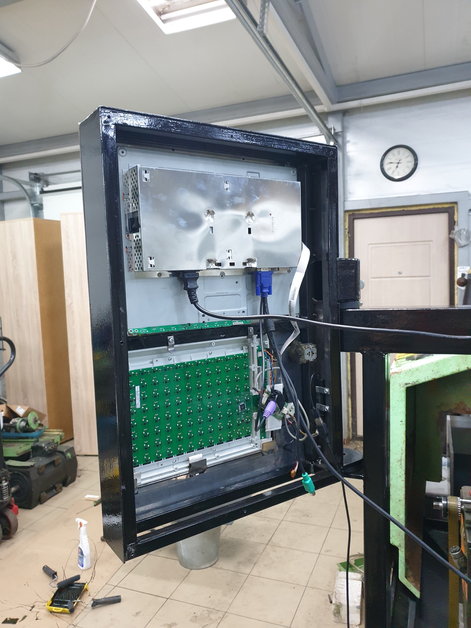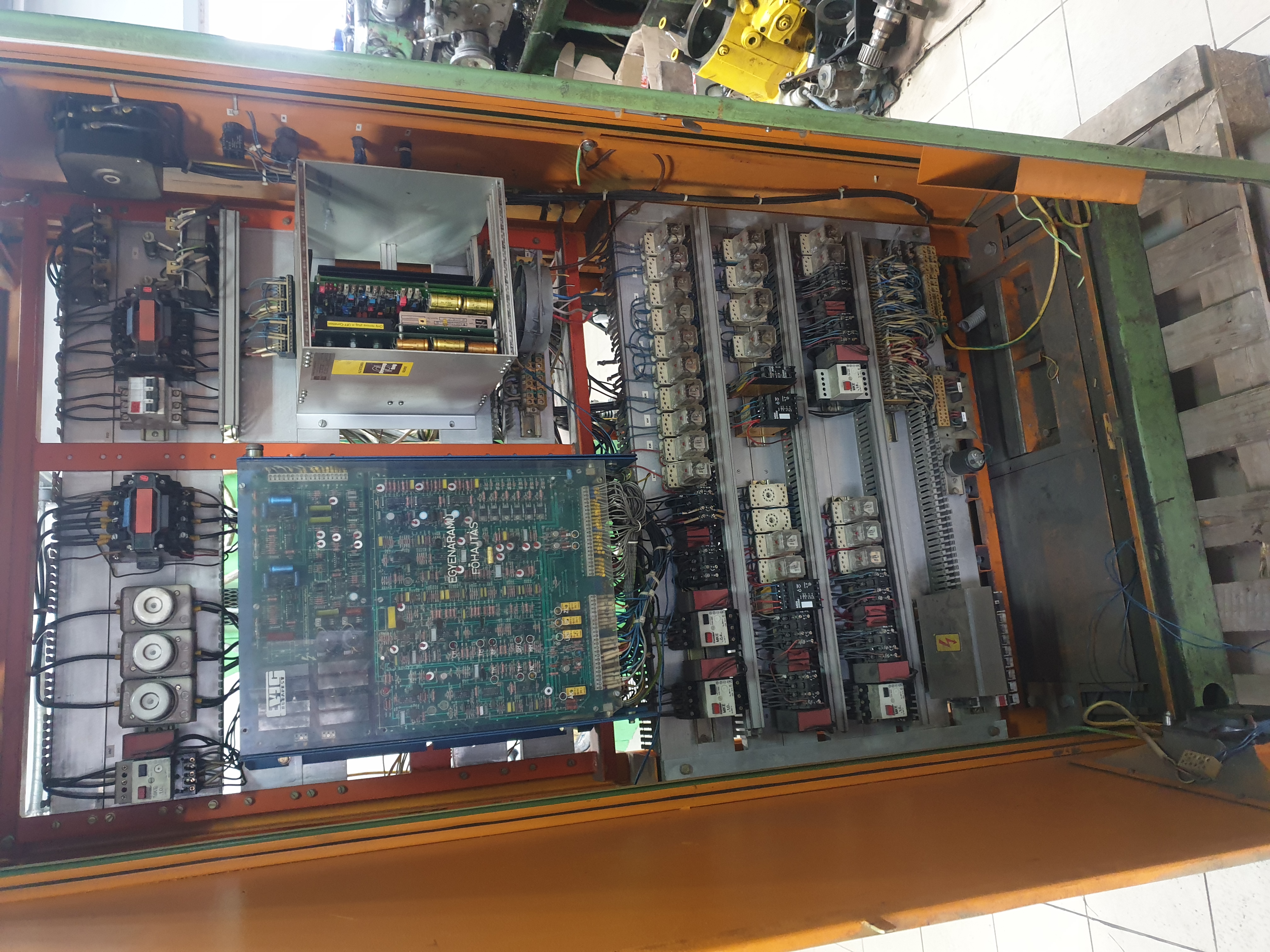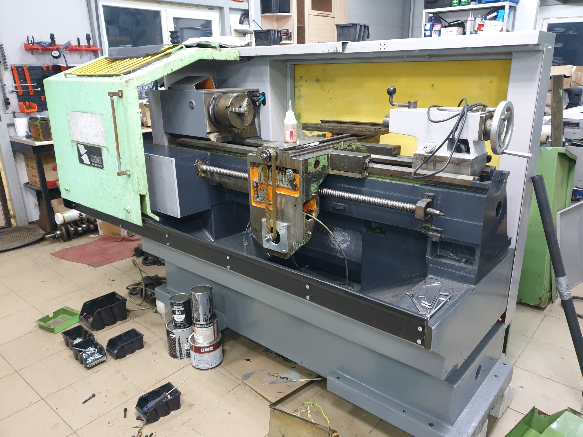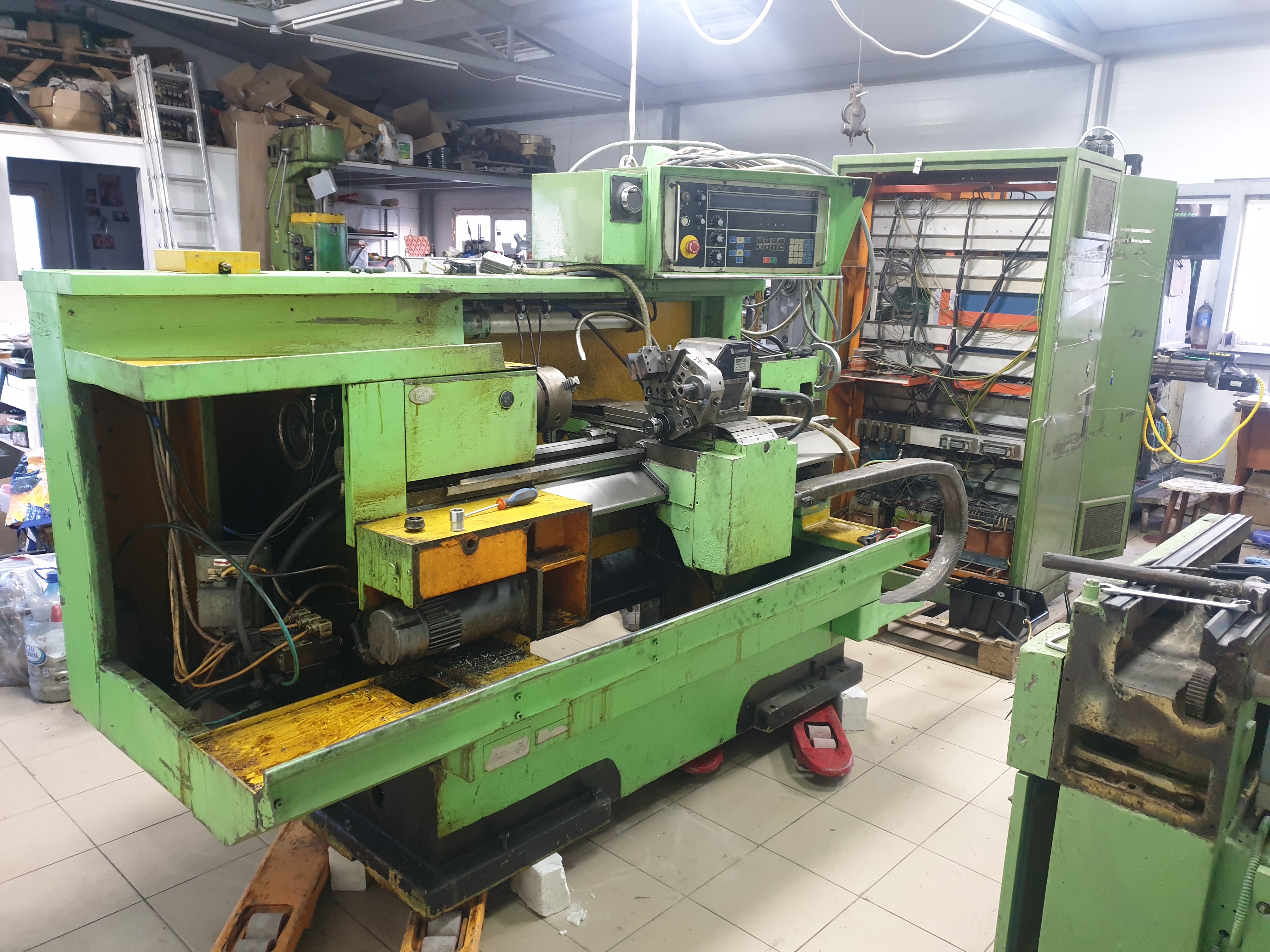 Что сделано. Станок отмыт, покрашен. Далее отказался от гигантского родного электрошкафа и сделал новый за станком, места у меня в цехе не так много. Часть электрики отвечающей за выбор передач, масло станцию, револьверку, сож и прочее перенес с родного шкафа проведя профилактику.