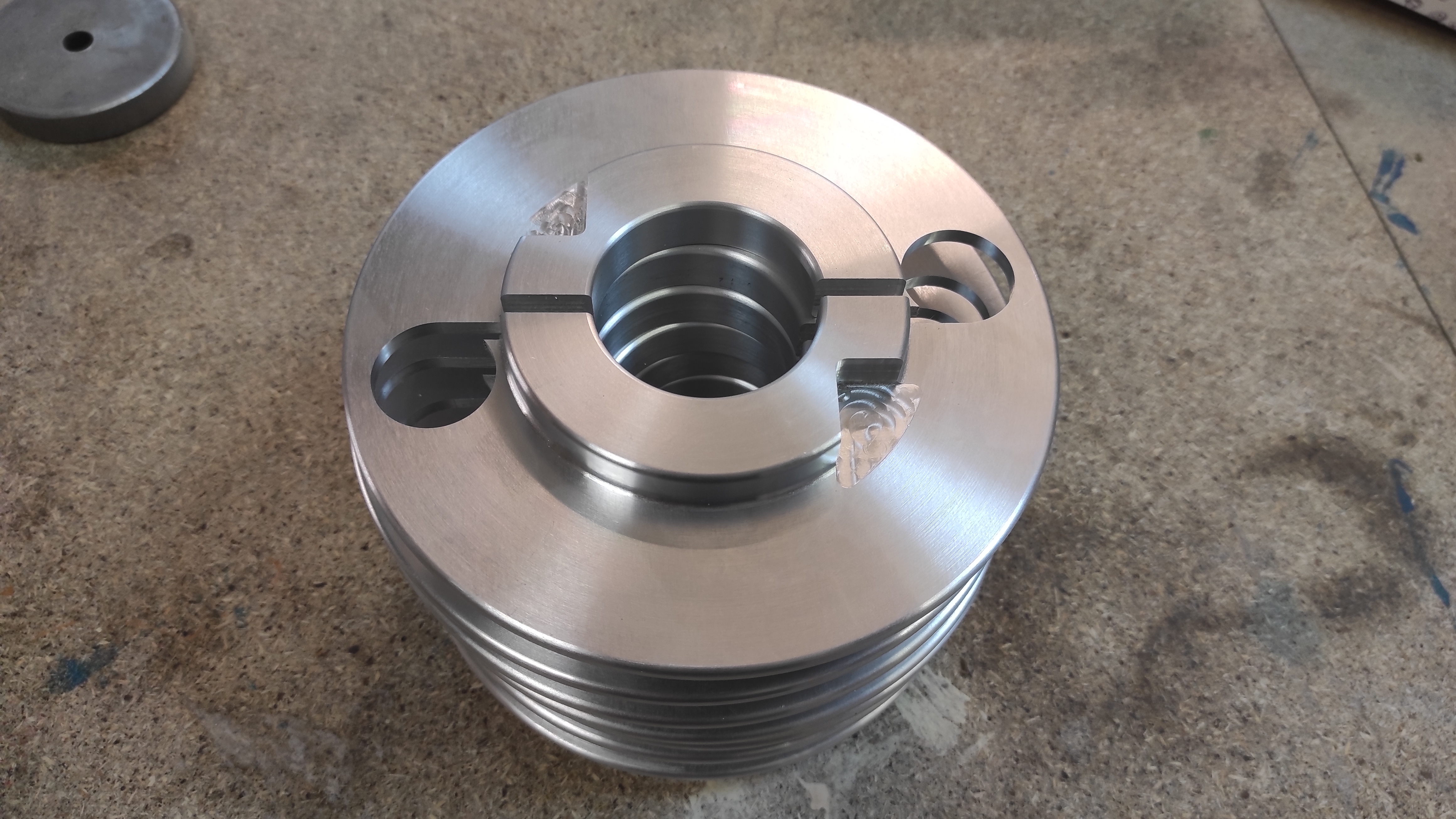 Для этих деталей расточной резец закреплял на внешнем блоке. Иначе приемлемого качества достичь не получалось. мелкосерийка, фторопласт. Не первый раз делаю эти детали, но если раньше жесткости револьверки хватало для расточки "внутренностей" то сейчас нет. После наработки появились люфты в муфте хирта, пришлось "вынести" расточной резец на внешний блок. Наработка у револьверки приличная (по моим меркам) это десятки тысяч деталей. На каждую деталь минимум по 3 смены инструмента, но как правило больше. По прикидкам револьверка прошла ~100 000 циклов смены инструмента. В связи с этим провел ревизию деталей с полной разборкой. Визуально износа нет, вал-втулки люфты-зазоры как изначально и были. На муфте хирта визуально износ тоже не заметен. Но люфт все же появился, причем ощущается именно на расточных резцах, т.е. если "тянуть с пелечем".
