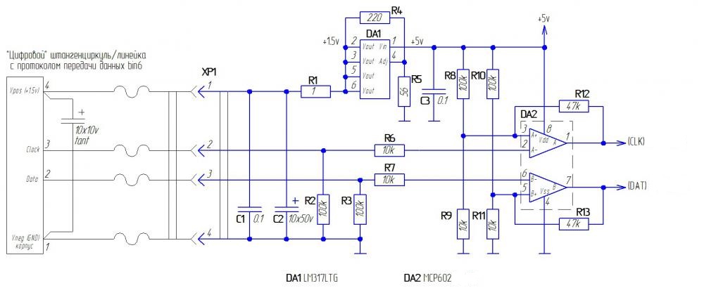 Напряжение с UBEC 5в 3а понижается через lm317 до 1.48в (и два конденсатора: керам. и электролит - номинал не помню) и так это идет к штангелям.