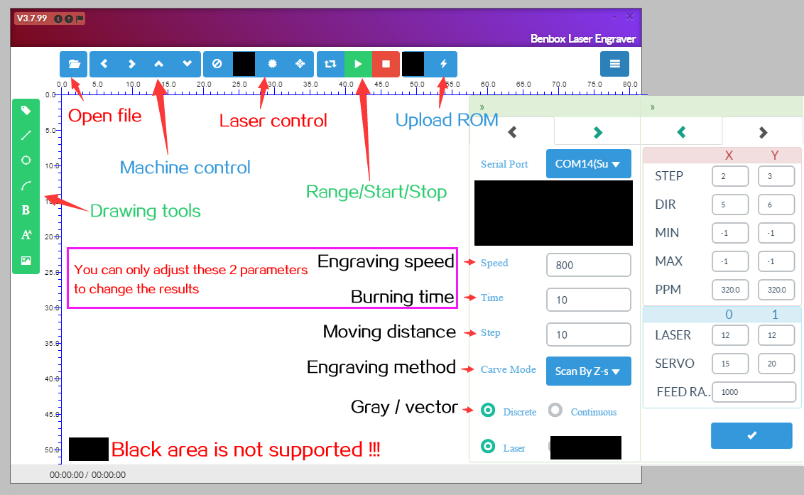 В том-то и дело, что вы смотрите мануал на версию 2.76, а у меня 3.7.99. В ней немного по-другому. Настройки порта, скорость, интенсивность - они настраиваются заранее. Потом выбираешь желаемый для обработки файл и жмёшь "старт". До вчерашнего дня я запускал этот BENBOX и мог "шевелить гравером, включать\выключать лазер, но более ничего не происходило. Вчера попытался сделать всё по инструкции, которую китаясь выслал с софтом (вложение). Прошил его, он отказался работать вовсе. Ни на что не реагирует. Даже программа GBRL Controller отказалась коннектиться с ним. Я написал китайцу, мол можешь мне выслать оригинальную прошивку ардуинки? - он ответил что только в понедельник. Я обрыл весь инет, нашёл прошивку тут (http://www.instructables.com/id/GRBL-Pi ... -Nano-v30/). Залил её, но теперь новая проблема: двигатели ведут себя как буд-то им не хватает мощности (зацикливаются на шагах - подтолкнёшь - едут). А по поводу того, что выкинуть лазер, якобы это не моё - отвечу: я не хотел бы изучать новый графический редактор, мне проще дальше рисовать в компасе, а G-code готовить либо так же в ARTCam'е, либо в каком-то другом G-кодмейкере, так как я планирую резать что-то на фрезере, а дальше гравировать на заготовках лазером. Смысл мне один и тот же рисунок рисовать в двух разных графических редакторах, которые не работают между собой (пытался импортировать компасовский вектор в линкскейп - ошибка)