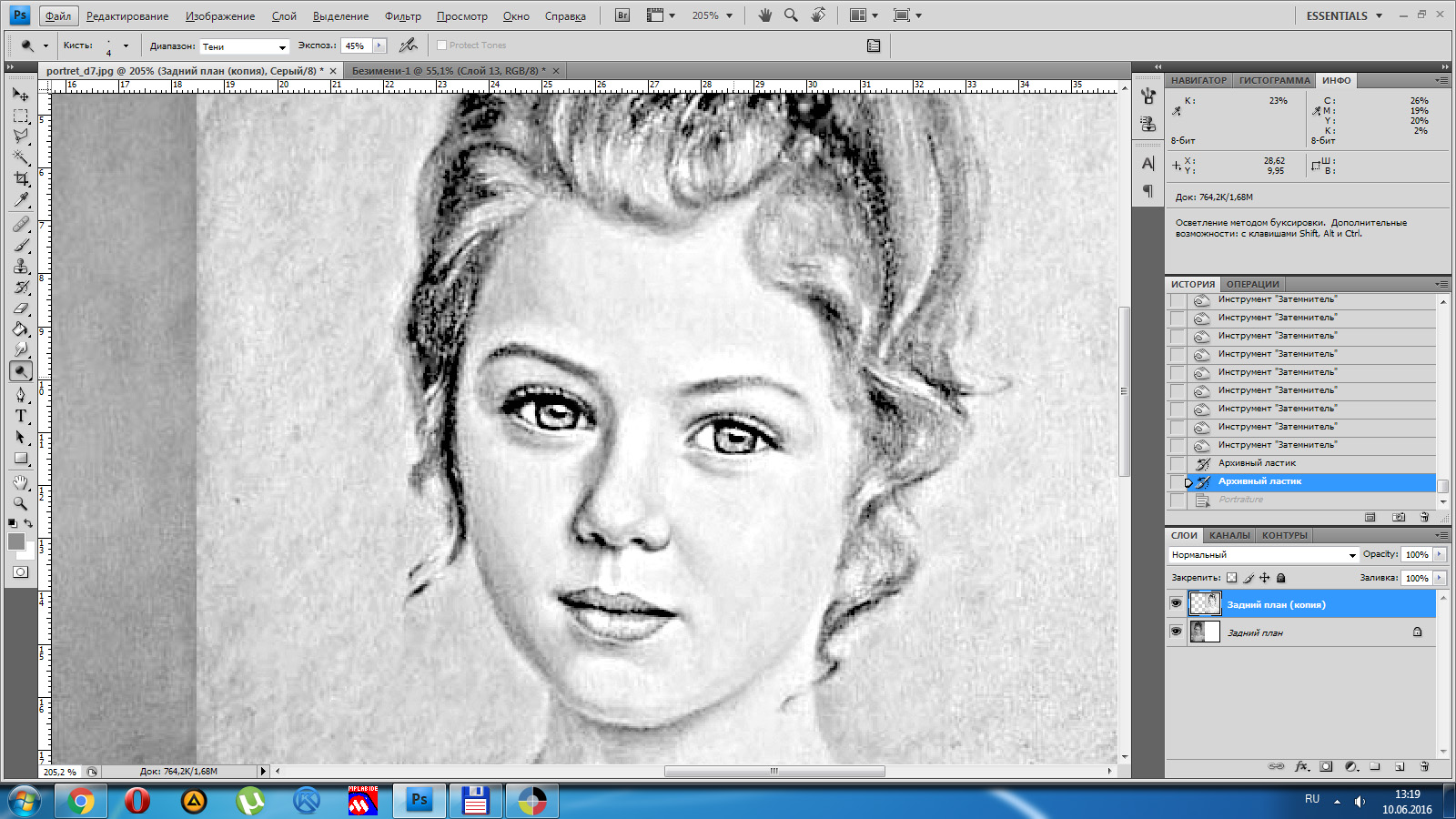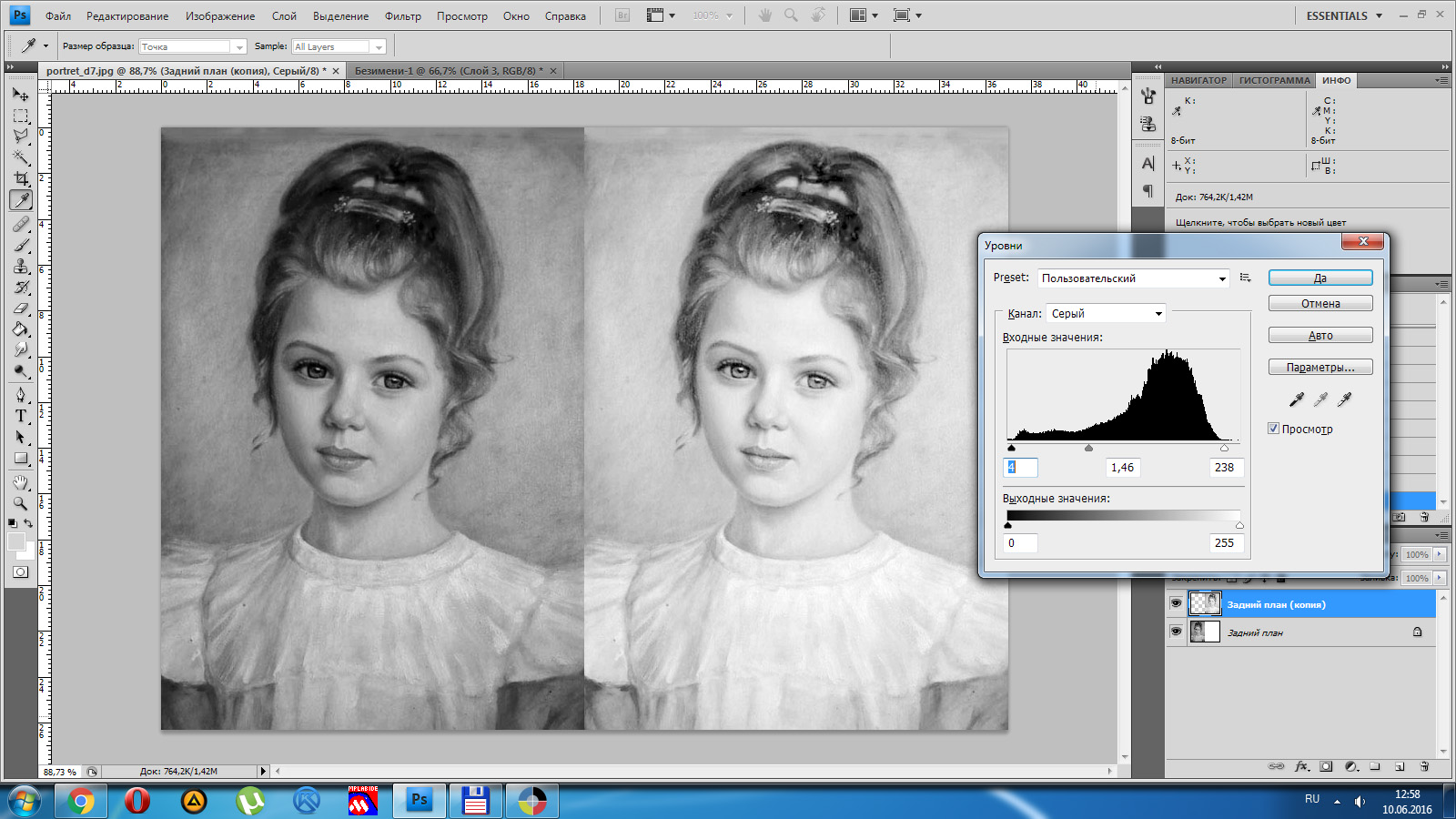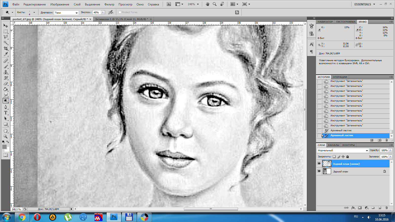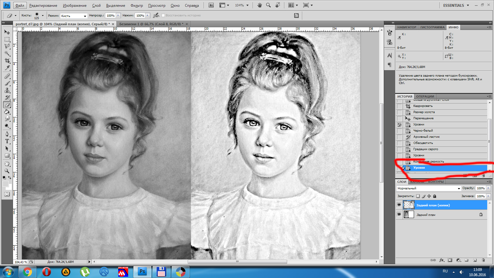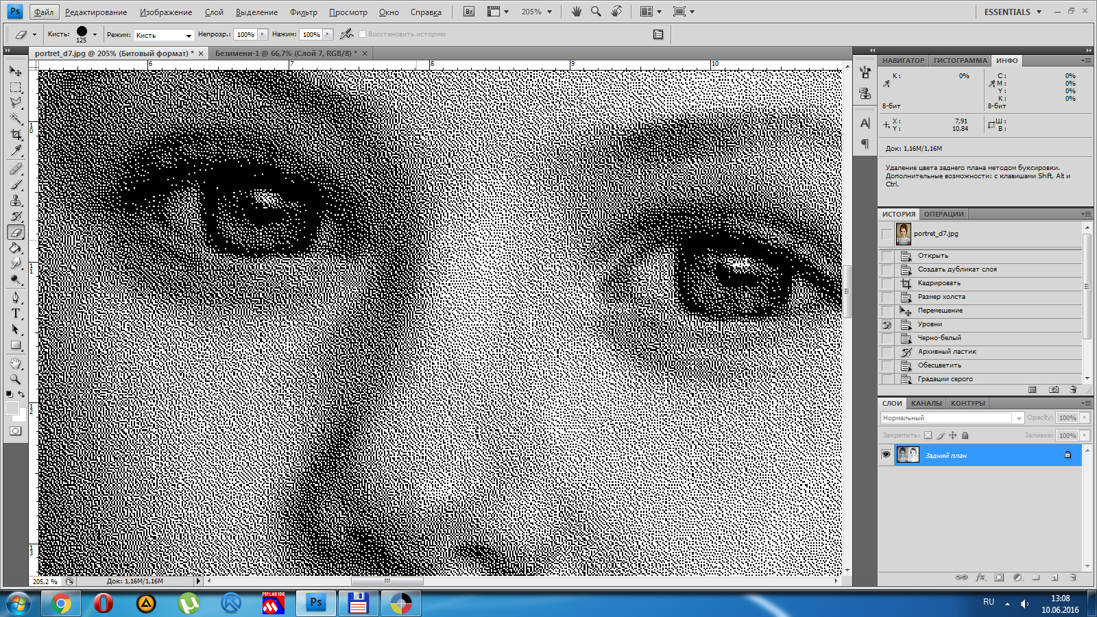 1 - настроить уровни, сделать светлее, но важно, чтобы не было заливок белым (CTRL+L) 2 - преобразовать в ЧБ, можно автоматом: Изображение-Режим-Градации серого, но лучше CTRL+Alt+Shift+B и только потом:Изображение-Режим-Градации серого 3 - при необходимости настраиваем уровни: 4 - повышаем резкость Фильтр-Резкость-Контурная резкость: 5 - при необходимости снова корректируем уровни 6 - Изображение - Режим -Битовый формат. Для гравировки с шагом 0,1 выбираем значение выхода 100 пикс/см., Метод - случайный дизеринг (тут можно экспериментировать, например сделать полутоновой растр, как в LaserCAD, только алгоритм преобразования в фотошопе лучше) оригинал без правок: 7 - просматриваем картинку, меня лично такое не устраивает, поэтому откатываем назад в истории: 8 - осветлителем/затемнителем поправляем резкость в проблемных местах (также при приближении видны артефакты jpeg, поэтому настоятельно советую установить для фотошопа плагин Portraiture, в данном случае пользоваться им только после повышения резкости!) 9 - проделываем операции пункта 6. Ну и на вкус и цвет фломастеры разные, поэтому вышеуказанные настройки не являются эталоном, они будут совсем не такие на другом портрете, например чем больше исходное разрешение, тем больший радиус нужно указывать в окне резкости, поэтому придётся поэкспериментировать.