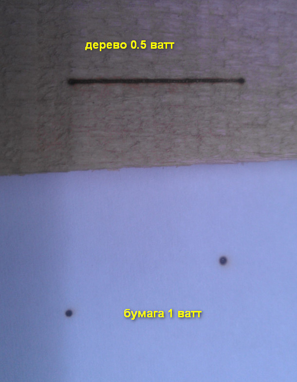 Для белой бумаги нужно минимум ватт, а вот по дереву уже и 0.5 ватт хватает, если скорость 100 мм/мин.