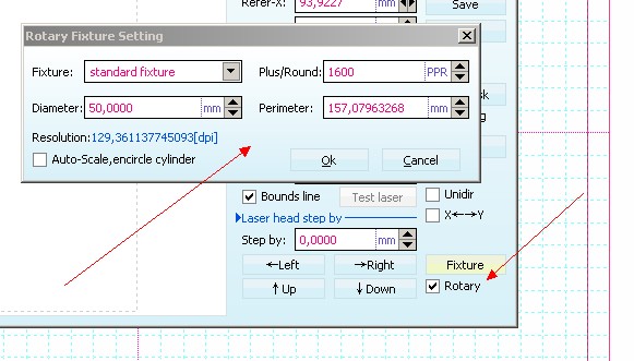 всё правильно.. если быть точнее.. то это перемещение головки на нужное вам расстояние (за одно нажатие)kupidon писал(а):Во-первых, Laser Head step by, это размер шага при ручном позиционировании точки ноля.kupidon писал(а):Во-вторых, если я не ошибаюсь, параметр dpi это только вертикальное разрешение, грубо говоря по мотору Y. По X оно не меняется.