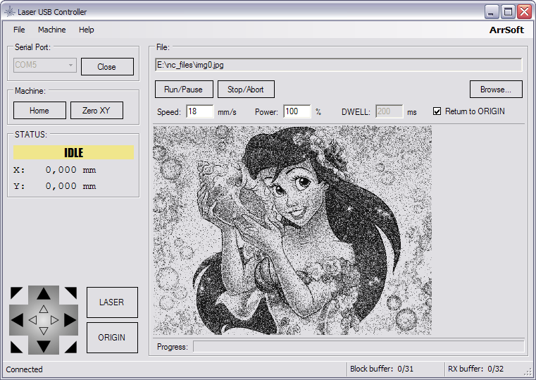 Простенькая программа для управления лазерным гравером через USB порт. Контроллер на Arduino Nano, выводы как у grbl, производительность гораздо выше. Поддерживаются HPGL файлы из CorelDRAW и Inkscape. Гравировка по черно-белым картинкам. Лазер всегда включается на заданной скорости, т.е. прежде чем лазер будет включен, он будет сначала разогнан до нужной скорости. Также поддерживаются концевые выключатели, при их наличии и в случае если движение превысит габариты вашего станка, вы получите соответсвующее уведомление при попытке запустить файл.