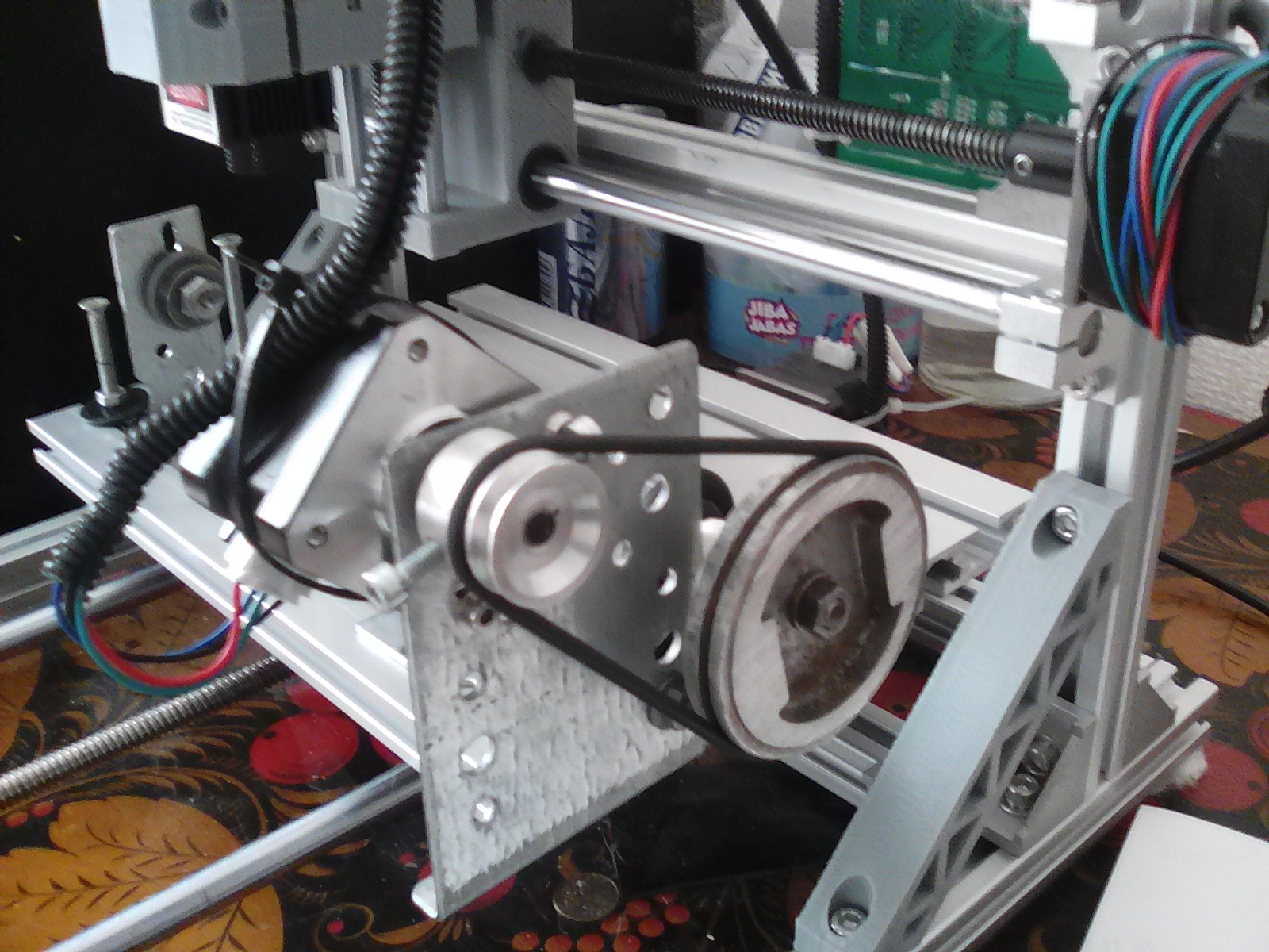 Китайский фрезерно- лазерный станок 2418. Пользуюсь только лазером. Сделал 4 ось - вращения , для работы на цилиндрических заготовках. Использована деталь от швейной машины ПМЗ для намотки шпулек в качестве основного вала , в неё были впаяны 3 иглы для удержания(вращения) заготовки , шкивы - днище поршня от какого-то движка внутреннего сгорания и малый шкив с небольшого эл.двигателя валявшегося в гараже уйму лет. ШД снят с оси Z . Может кому пригодится. Немного видео https://youtu.be/KGUxeApLVfg .