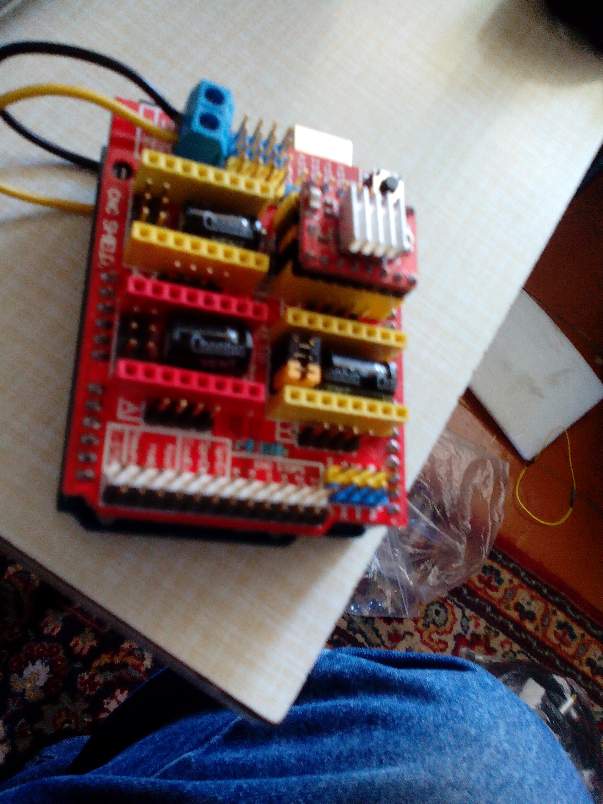 имеющаяся у меня сборка Arduino Uno+CNC Shield v3+2 драйвера А4988 была собрана вот так: (1 и 2 фото). При подаче питания на плату и подключении ее к USB компьютера программы плату видели, автоматика подключалась, но моторы