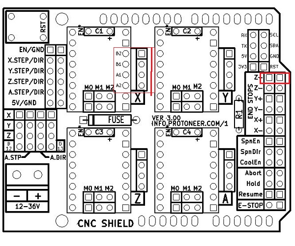 Устанавливать драйвер необходимо так, чтобы пины для подачи питания на обмотки ШД в драйвере и шилде совпадали (в случае с А4988 : пин 2В драйвера на пин В2 шилда, соответственно, 2А на В1, 1А на А1, 1В на А2). НЕЛЬЗЯ переустанавливать драйвера при подключенном питании к плате и подключенных к плате моторах . После "переворачивания" драйверов (регулятором напряжения драйвера ближе подводу питания на шилд) мотор заработал. Правда один