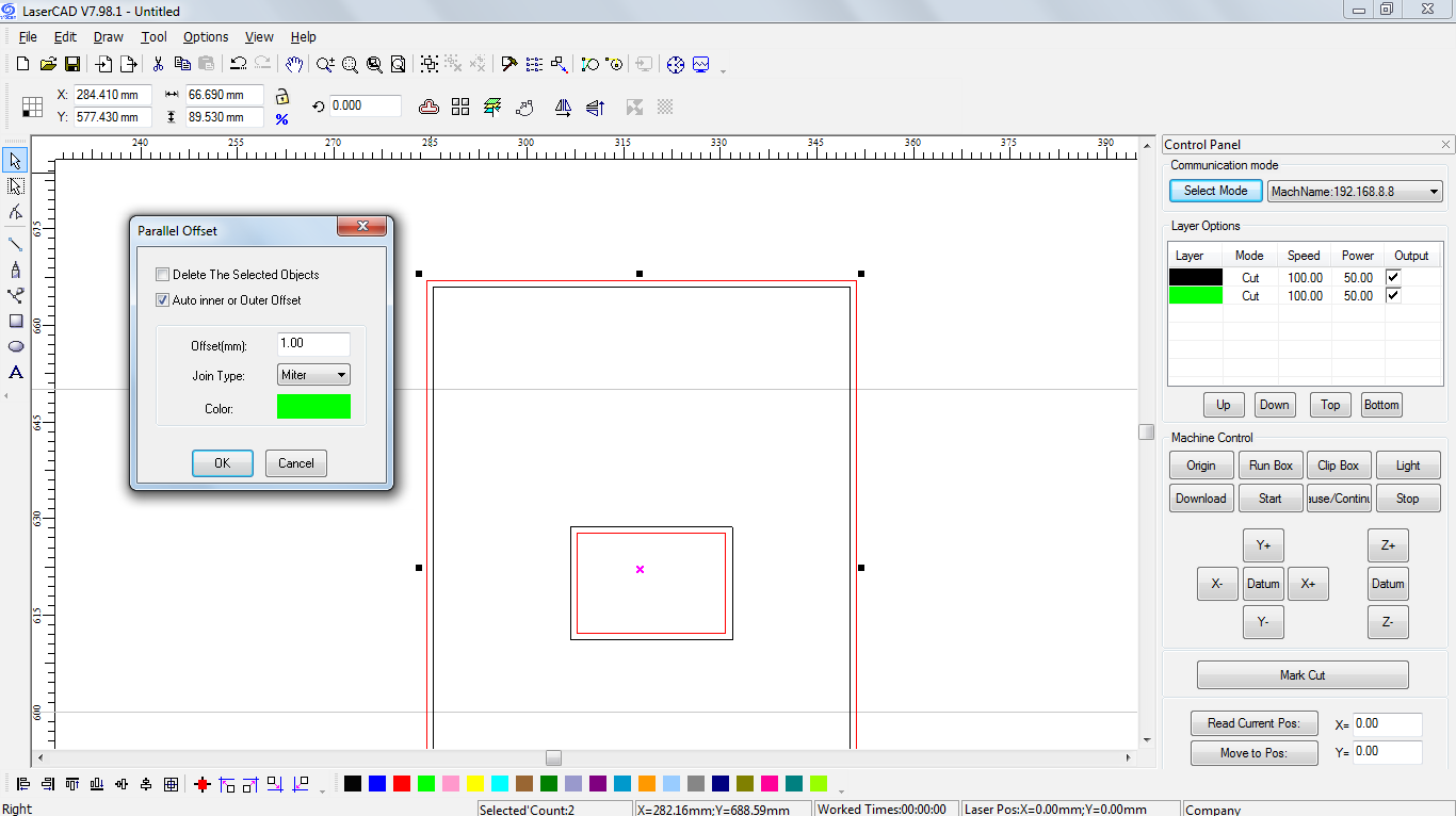 В lasercad нет компенсации по умолчанию как таковой , но ежели очень хочется, то есть встроенная функция оффсета , им можно исходный контур реза сместить наружу или внутрь на необходимое расстояние.......или как на скрине автоматом внешний контур наружу а внутренний внутрь
