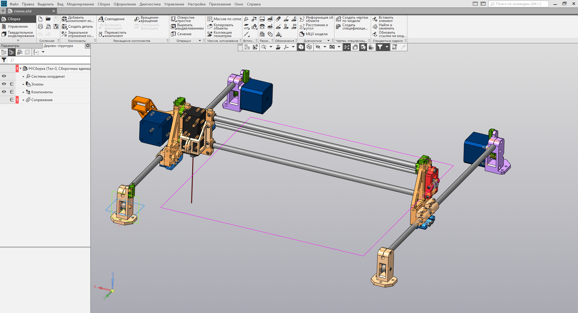 Что пробовал: Искал ИД ошибок, ругалось на кривые вроде как, менял разрешения кривых. Менял ускорения от 1000 мм/сек2 до 5, на 5 ужас как все медленно. На кореХУ ускорения стоят 1000 мм/сек2, но там понятно - быстрая кинематика. Снижал дробление шагов до 1/8 и количество шагов 40 на мм (дальше не снижал, ибо и так уже невыносимо орет), ставил ТМС2208. Менял скорости от 5000 мм/мин до 1000, менял паузу по оси Z. Снимал ремни, установил обдув драйверов, посадил на провода до моторов и концов феритовые кольца. Менял кабель и его длинну. Параллелил ШД на одном драйвере, разводил на разные драйверы. Повышал Вреф до 100% (1,04в), а не как по рекомендации 70% (0,73в). Смазывал направляющие и "подшипники" из ПЛА. Менял скорость порта на 115200 и обратно на 57600. Даже спалил один тмс2208 и мегу 2560.