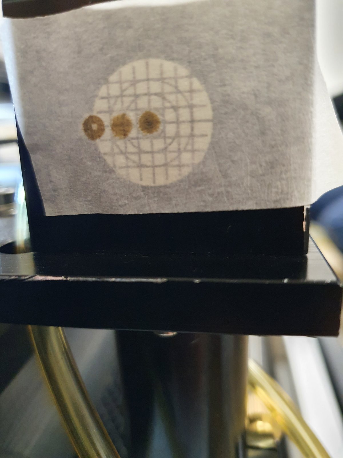 - Верхний левый угол начал прорезать материал, но луч остался толстым.