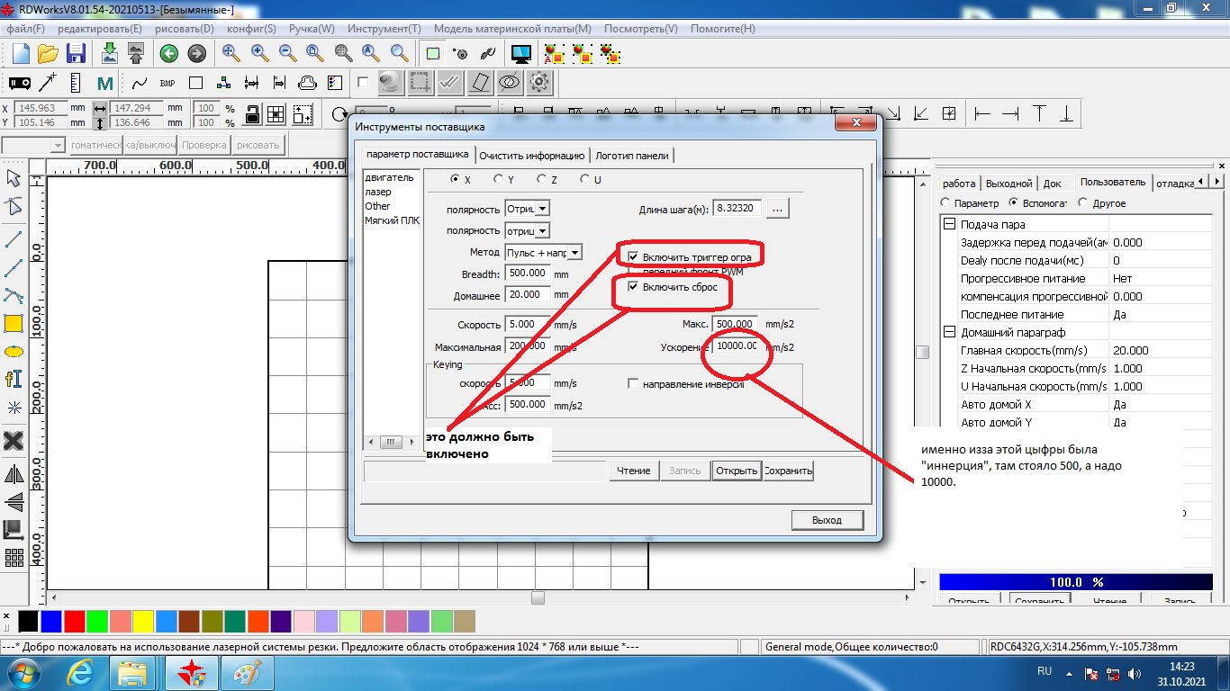 Собрал механику и электронику станка, Плата управления установлена руида RD6432G, концеики SN-04N. Направление движения в нужную сторону происходит, даже довольно близко к заданному размеру (потом донастрою более точно), расположение элементов на поле станка такое же, как и на поле RDworks, стрелки ведут голову в правильном направлении. Скорости и ускорения на время настройки поставил низкие. Проблема с поиском нуля. Когда я при выключенном станке ставлю голову в правый верхний угол, в такое положение, чтобы её видели концевики и включаю станок то потом могу нормально с панели руиды выставить Х и У на ноль, он видит концевики, "щупает" их, отводит голову в заданную точку (30мм плево и вниз отступ от сработки концевиков по обеим осям). А вот если я отвожу голову в зону, где концевики её не видят, то, когда она идёт их искать, то сносит их даже после сработки и даже пытается ещё ехать. Кроме того после настройки руиды на ноль по осям, если я перезапускаю станок, то она опять ставит значение осей 10000. Автовозвращение в ноль отключил через RDworks поэтому.