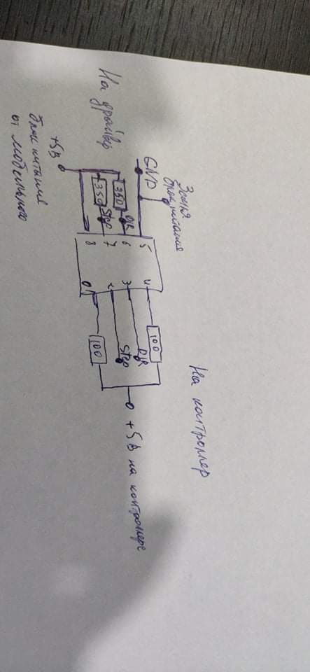 Доброго дня уважаемые! Спаял я плату согласно схемы. Всё прозвонил, замыканий нет. 5вольт на плату подаётся. Перепроверил провода. При подаче питания экран на контроллере и драйвере работает. Но при ручном перемешении с контроллера никаких лвижений со стороны двигателя не наблюдается(... Согласно схемы объеденил gnd с платы, с gnd блока питания драйвера 12 вольт и с gnd 5v. Dir к Dir step к step. Получается что я на драйаер вывел только gnd, step, dir. Почему то на схеме 5 вольт не выходят на драйаер... Может в этом ошибка?