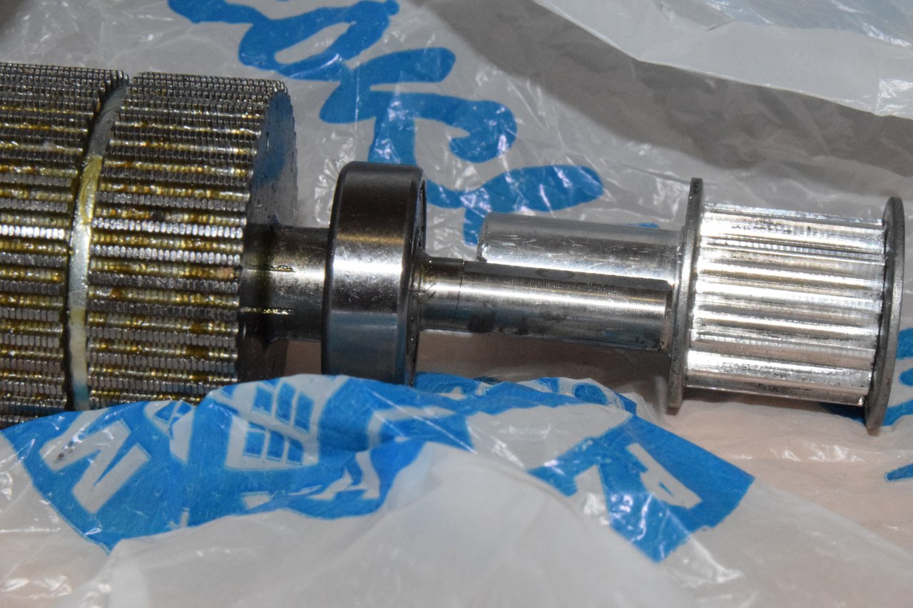 Как я уже упоминал, я подглядел прямую передачу на китайском станке, но там был другой ремень: узкий и менее упругий на изгиб, в моём же ремне стальной корд - этим думаю всё сказано. На китайце узкий шкив, из моего же шкива получился длинный рычаг, за который "тянет" упругий ремень, плюс тонкая ось 6,35 мм, итог на фото.