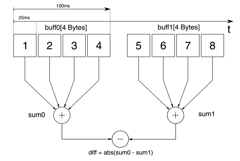 Первый элемент фильтрации движения является использование двух четырех-байтовых буфера для непрерывного сохранения данных в диапазоне одной второй раз. Следующим шагом создает скользящих средних с помощью двух сумм значений, хранящихся в в каждом буфере и вычисления разности между этими суммами. Это вычисленное значение сравнивается со статическим порога, который соответствует максимальной выходной шум от ИК-датчика.