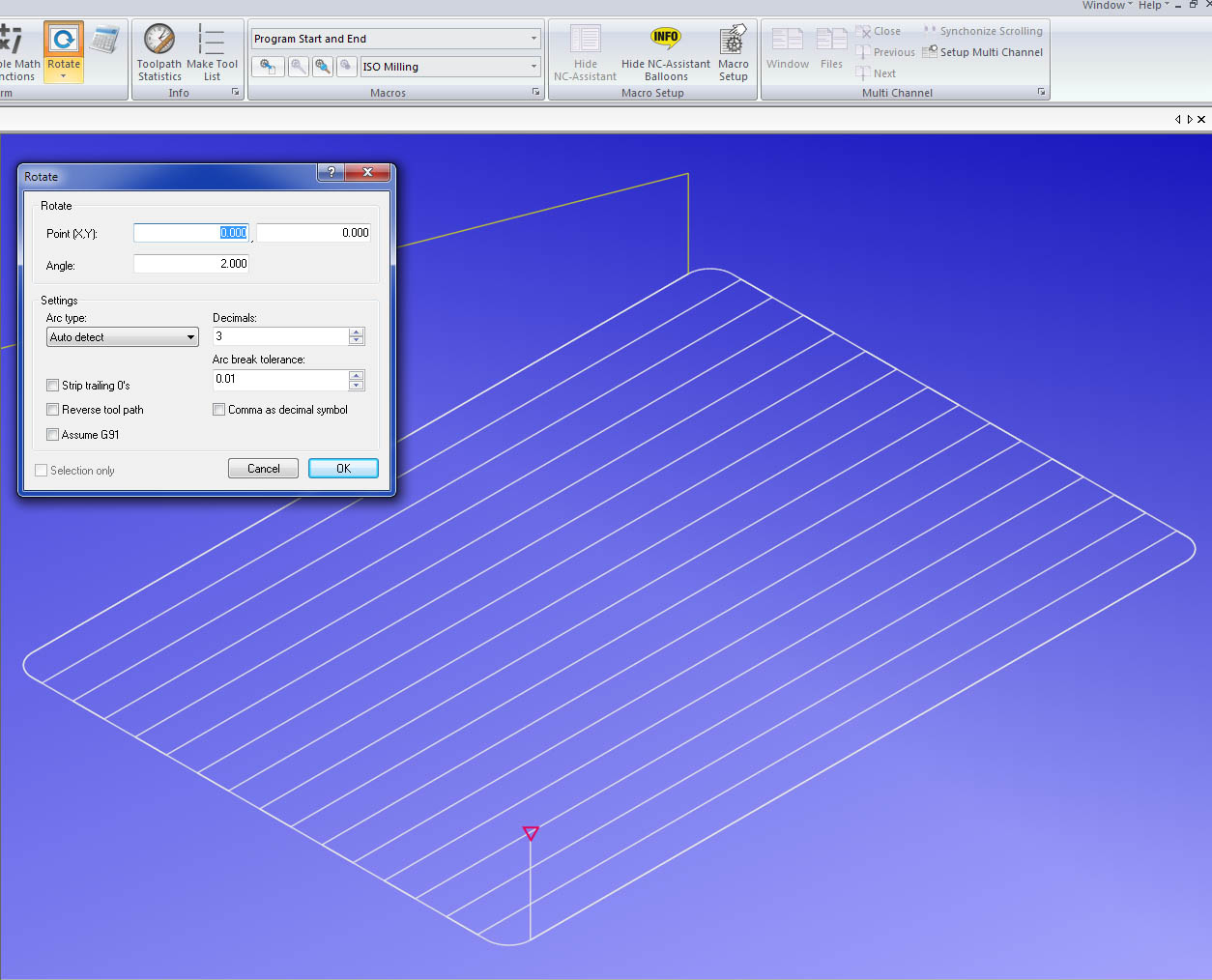 Такой вот карман, примерно. Открыто окошко Rotate, подскажите, где выбирать ось вращения? CIMCO 7.0
