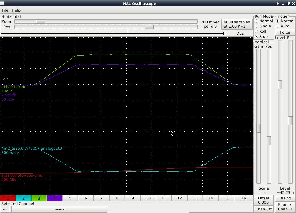 здес setp scale.0.gain -0.012 и setp lowpass.0.gain 1 на ПИД Р=0.5 . в ини FERROR = 15.0