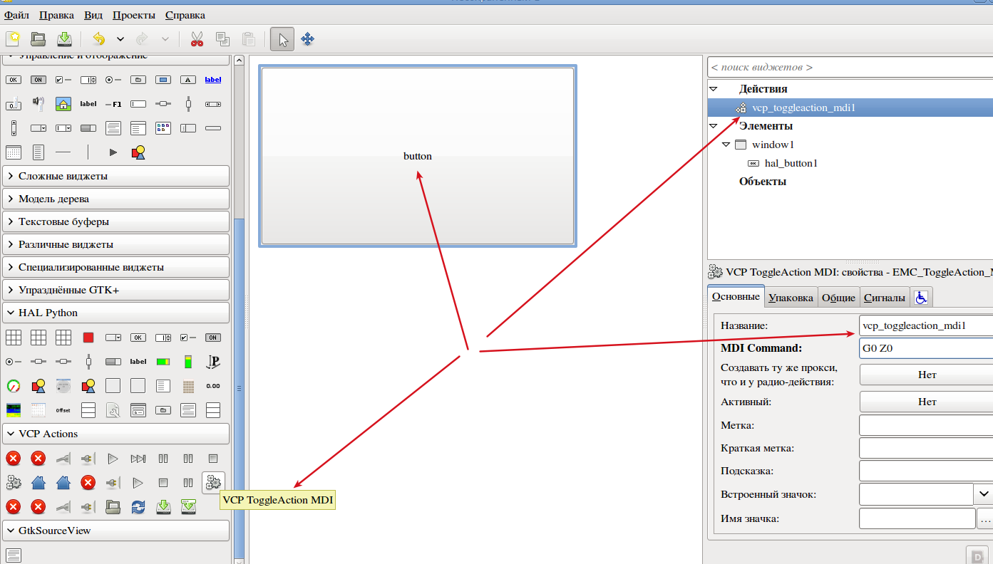 можно "вешать" mdi команды на кнопки (hal_button) прямо в Glade: