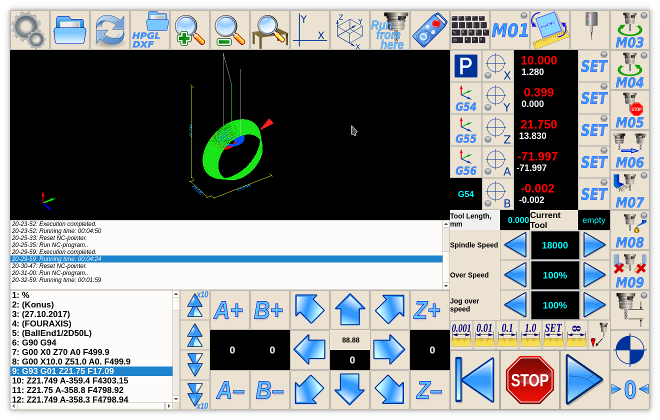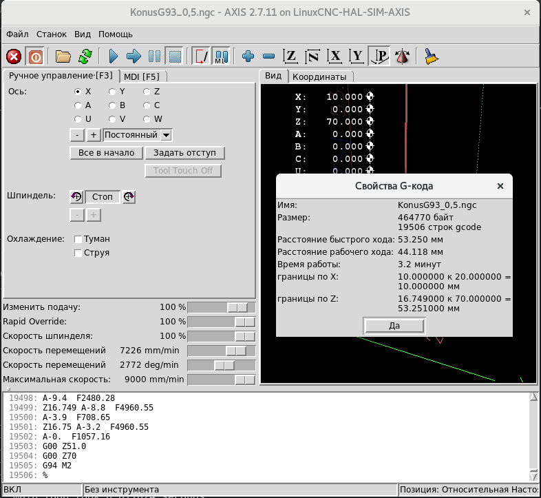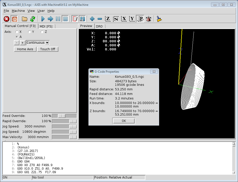 на myCNC - время обработки - 4:24, неравномерность движения есть только на первом и последнем вращении и связана со странностью в G-коде.kalexmax писал(а):1 Обработка поверхности конуса под G93 с высокой точностью, ср. сегмент поворота=0.5град. Тобр=13мин., большая неравномерность обр-ки.