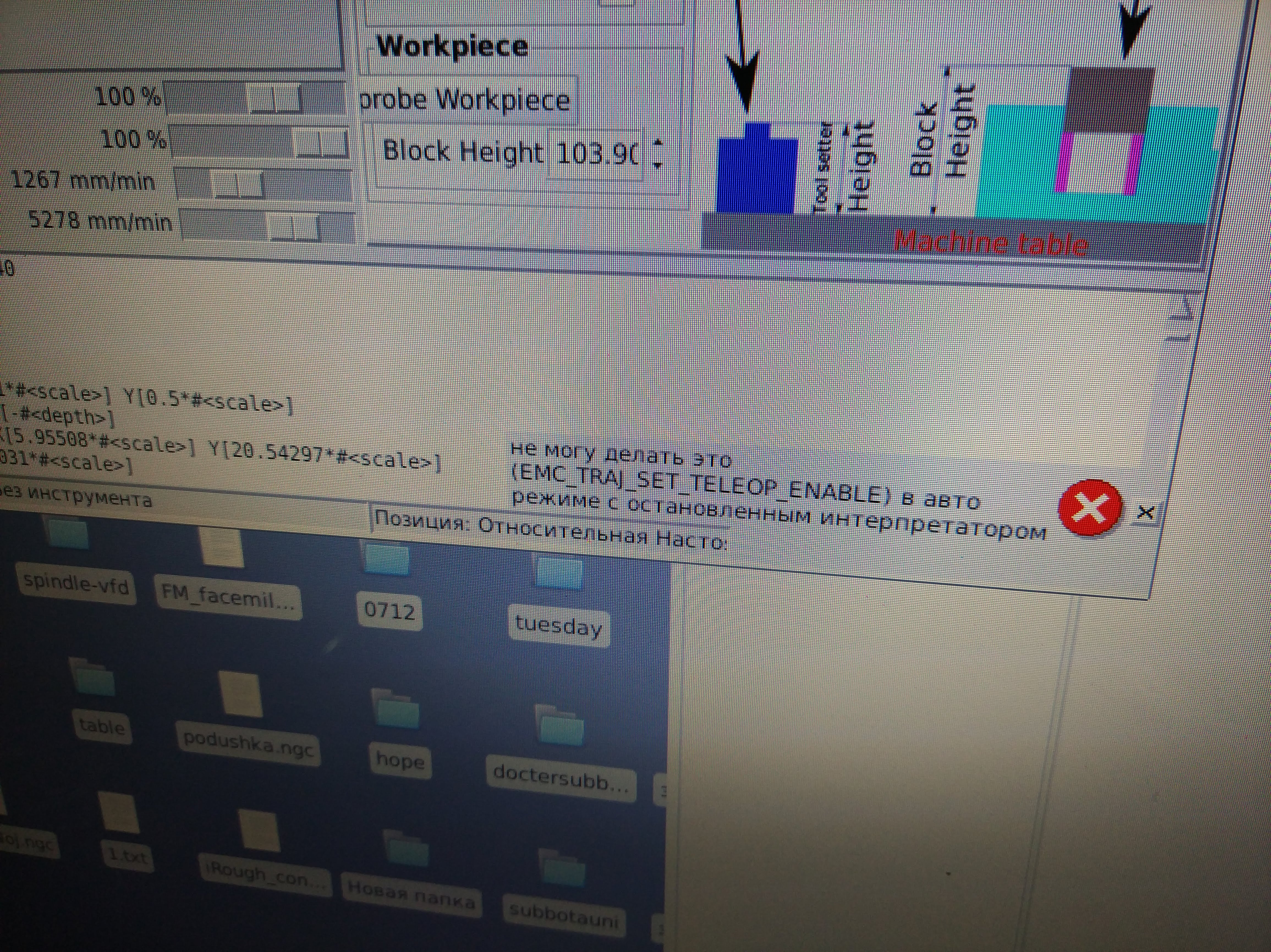 "не могу делать это (EMC_TRA)_SET_TELEOP_ENABLE) в авто-режиме с остановленным интерпретатором" - это например может быть попыткой выполнить G-код в "режиме ручных перемещений" (TELEOP).