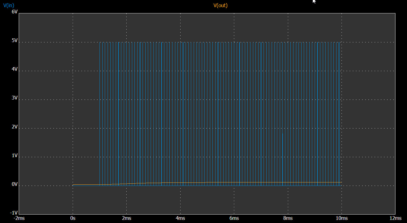 Сергей Саныч, как обычно, прав! Что бы мы без него делали :hehehe: И действительно, если у ШИМ генератора выставить ненулевые задержки фронта/спада, линейность вывода встаёт на место. Входная скважность 50% теперь соответствует 5V на выходе.