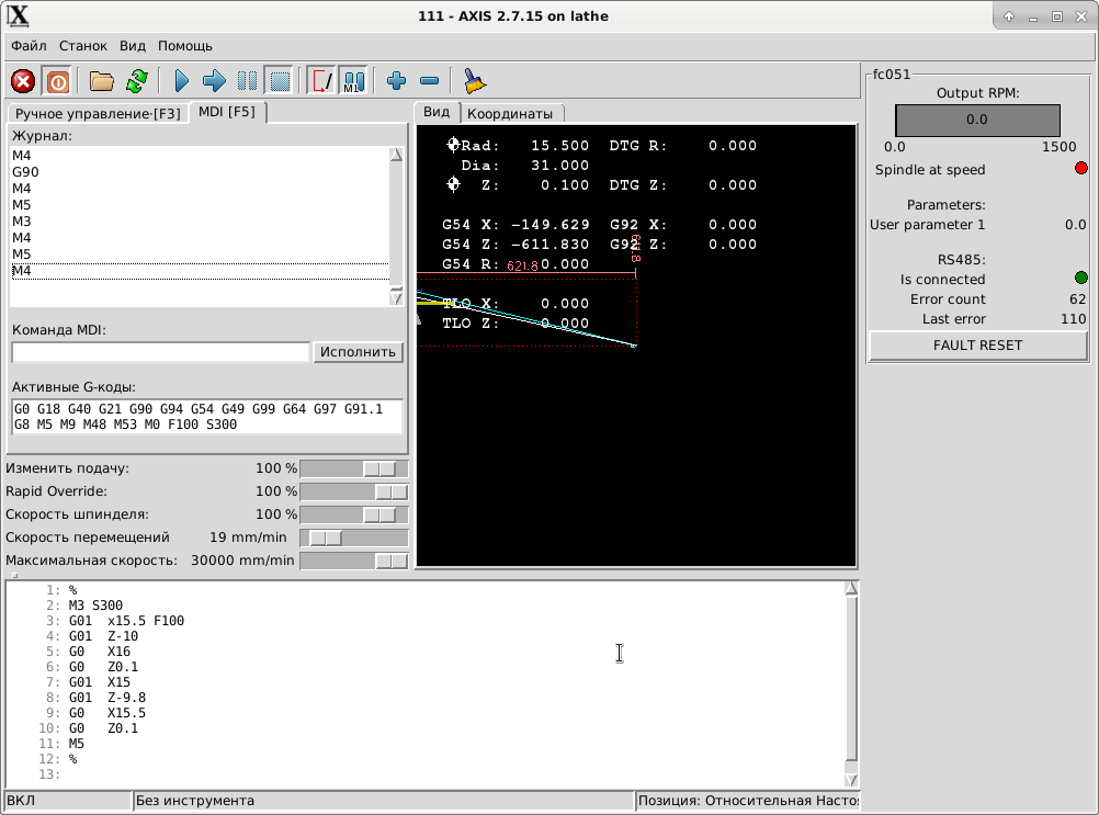 6 Составил тестовую уп начинается со старта шпинделя M3 S300 -> Запускается шпиндель далее программа не отрабатывает. Сама программа видна на скрине в окне axis