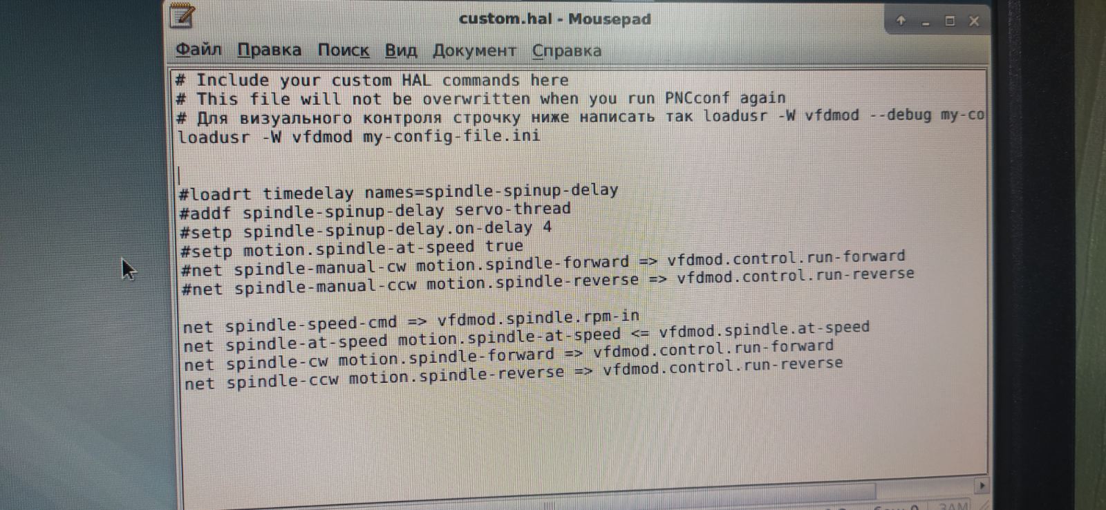 Я считал это vfdmod.spindle.at-speed . И теперь кажется понимаю в чем дело, в MDI при задании оборотов на ПЧ, этот пин HAL не изменяется. всегда False.Возможно стоит просто применить пин spindle-on? Он отрабатывает корректно.