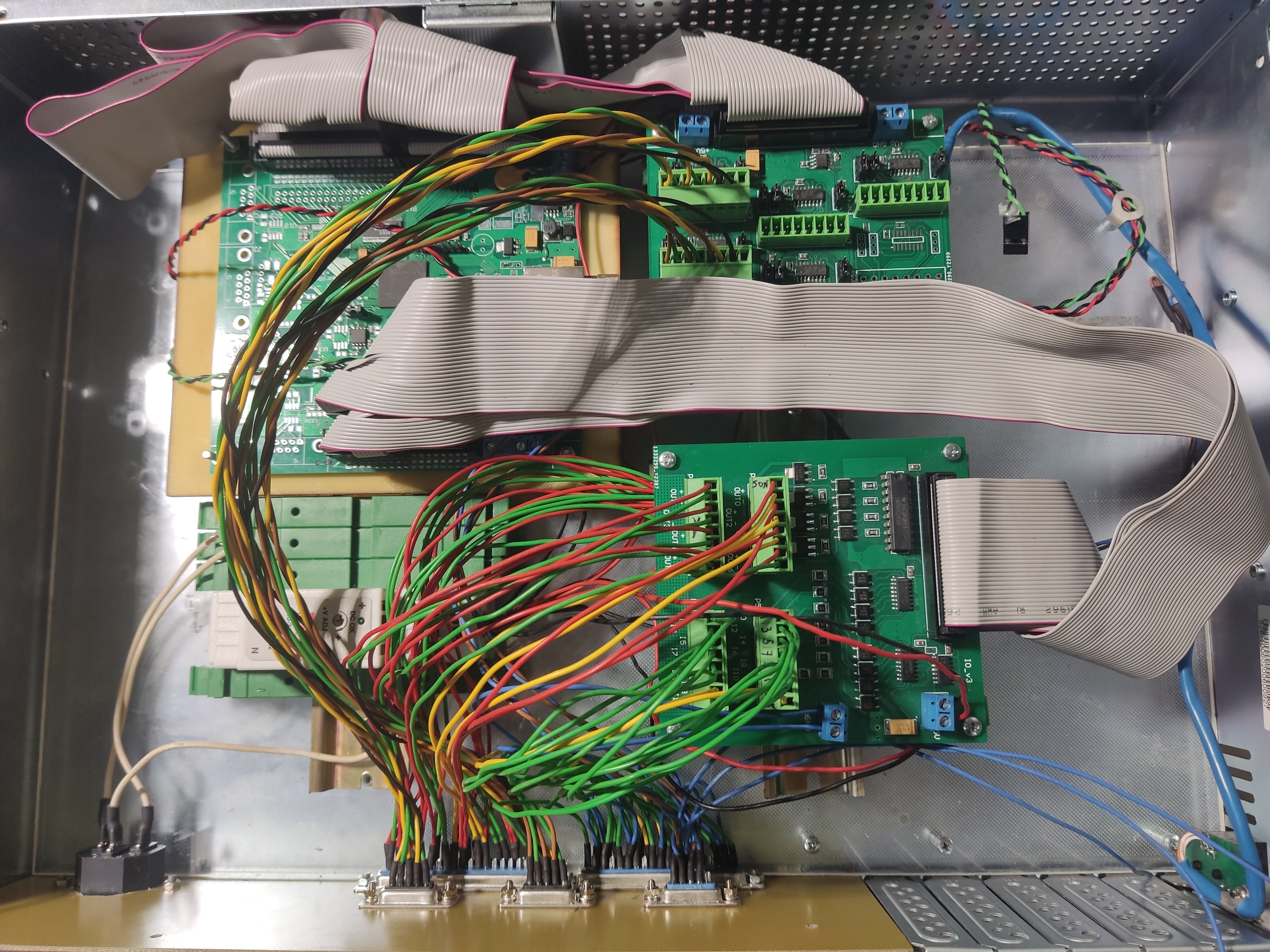 Спасибо за чудесные платы, всё отлично работает. Нашёл правда одну странность, пины с инверсией принимают состояние, только с нажатой кнопкой "Питание станка". Версия плат eth. Ещё, как мне кажется, платы неплохо бы унифицировать по размеру с крепежом на дин рейку. Более менее подходящие нашёл на Али, но майн пришлось ставить на пластину из текстолита. IO, PWM, ENCODERS установил в два этажа. Связь по сети пока не теряла. Всё заземлено, платы вывода к исполнительным устройствам подключены через реле. Патч-корд обычный, не экранированный. Платы смонтированы в отдельном железном ящике. Корпус ящика и компьютера соеденены между собой по земле.