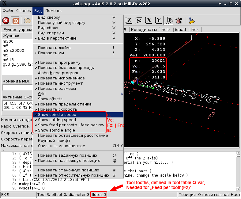 Данный мод добавляет в Axis индикацию оборотов, скорость резания, подачу на зуб(или на оборот) и угол поворота шпинделя.