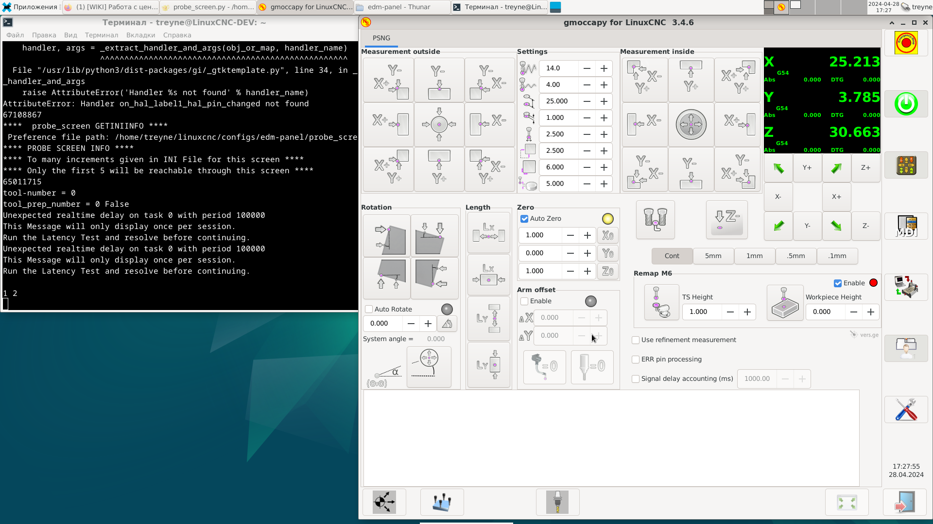 Всем привет ребятушки, нашёл эту панельку для центроискателя. Просто пушка, в ней есть всё что нужно, установил по инструкции, подключил, прямо из коробки не работает. Ругается на строчку в файле "/home/treyne/linuxcnc/configs/edm-panel/psng/python/probe_screen.py", line 415, in error_poll