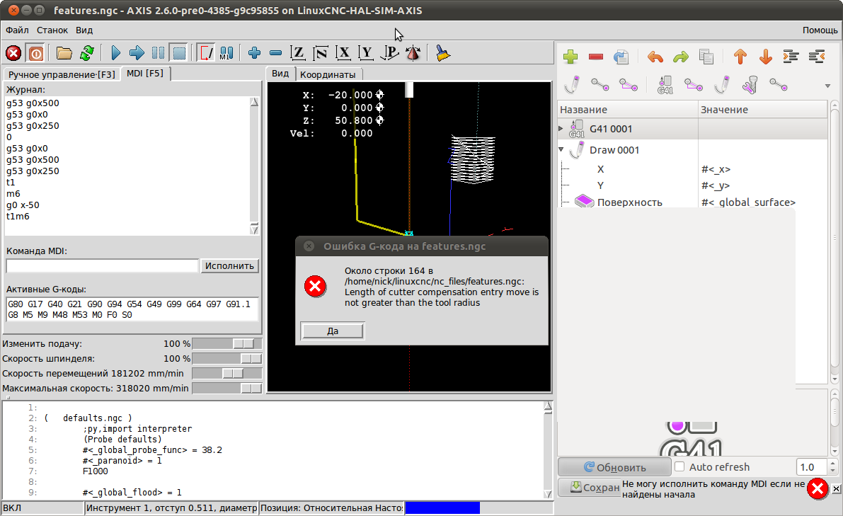 Непонятное ограничение linuxcnc, убивающее весь смысл команд G41 G42, поскольку без коротких перемещений ну никак не обойтись.The lead in move must be at least as long as the tool radius