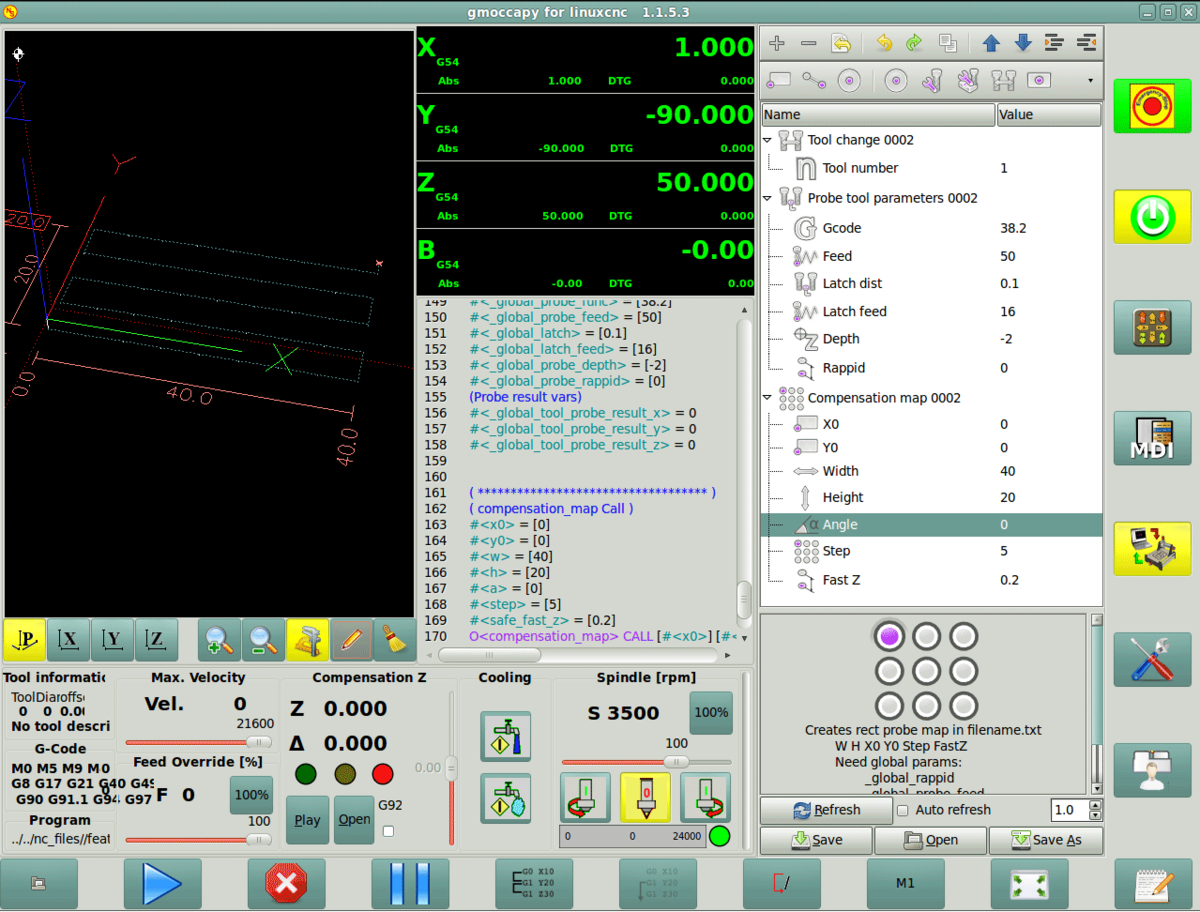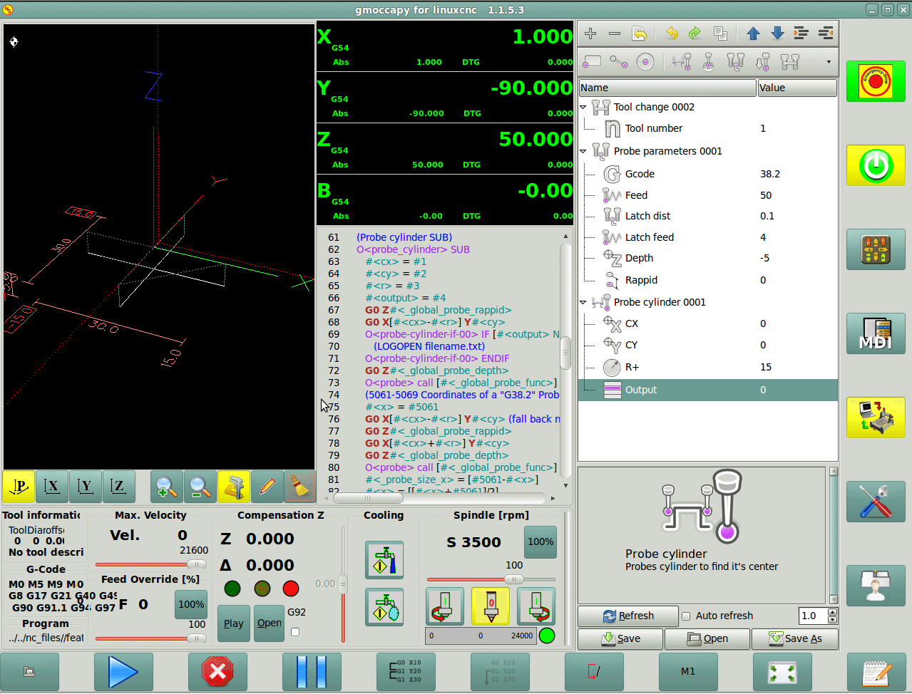 Также задействован текущий диаметр инструмента (конкретнее - внутренний linuxcnc параметр #5410), поэтому на картинках присутствует "Tool change", он задает текущий инструмент(у меня probe прописана в таблице под №1)