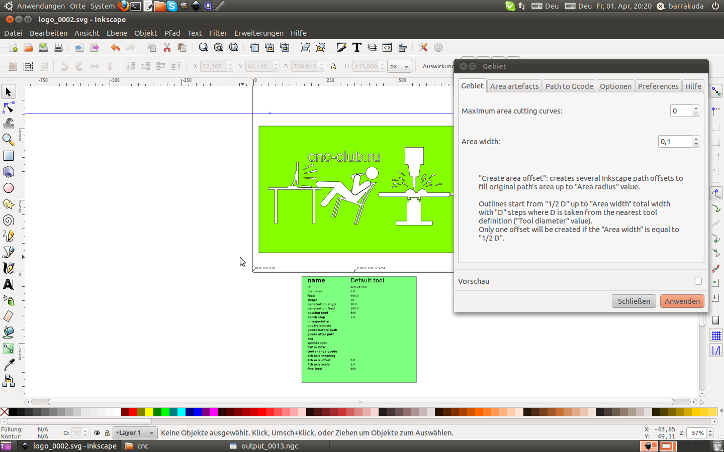 root писал(а):Проще работать с отдельными вкладками из меню Расширения - Gcodetools - Area.