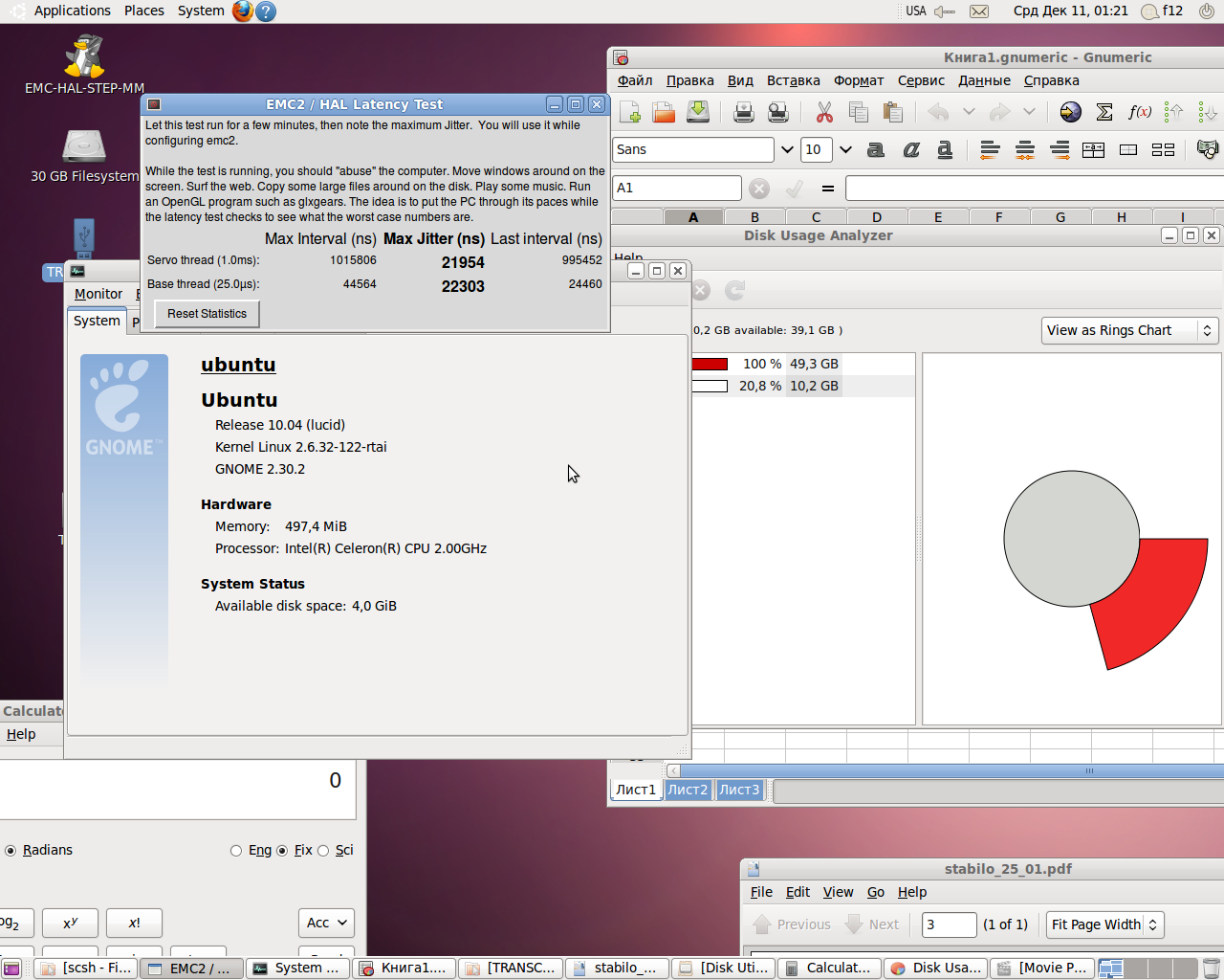 Лучше нагрузить по полной, тогда мы обезопасимся от аварийных ситуаций. Вообще все дополнительный приложения не должны сильно влиять на работу EMC2 - у нее приоритет очень высокий. Но вот некоторые девайсы с хитрыми драйверами могут наговнякать. Например, тот же AXIS пользуется OpenGL для отрисовки траектории инструмента. Поэтому лучше нагрузить компьютер по полной.