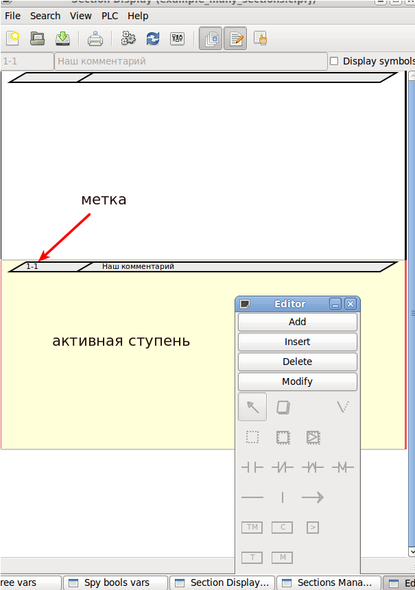 Для отрисовки используем окно Editor , а для активации элементов окно Spy bools vars