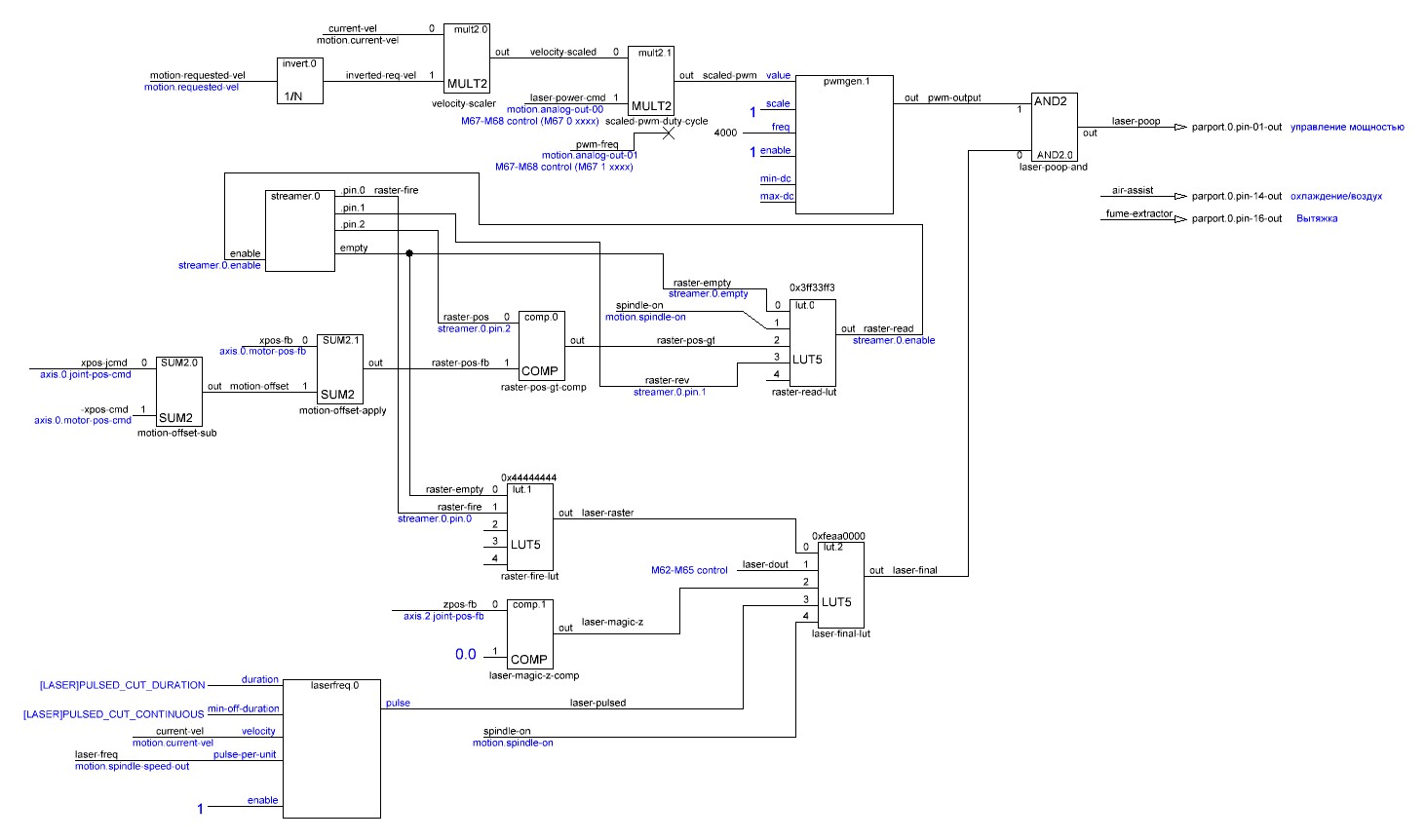 Для управления охладителем и подачей воздуха, имется отдельный выход 1 (16, прим перев) который включается автоматически по M3 и выключается по M5 через время , указанное в INI как EXTRA_CHILLER_TIME. (на самом деле, похоже это хотелки, а управление включением вытяжки и подачи воздуха в конце hal-файла . pin14 - воздух/охлаждение, pin16 - вытяжка прим перев)