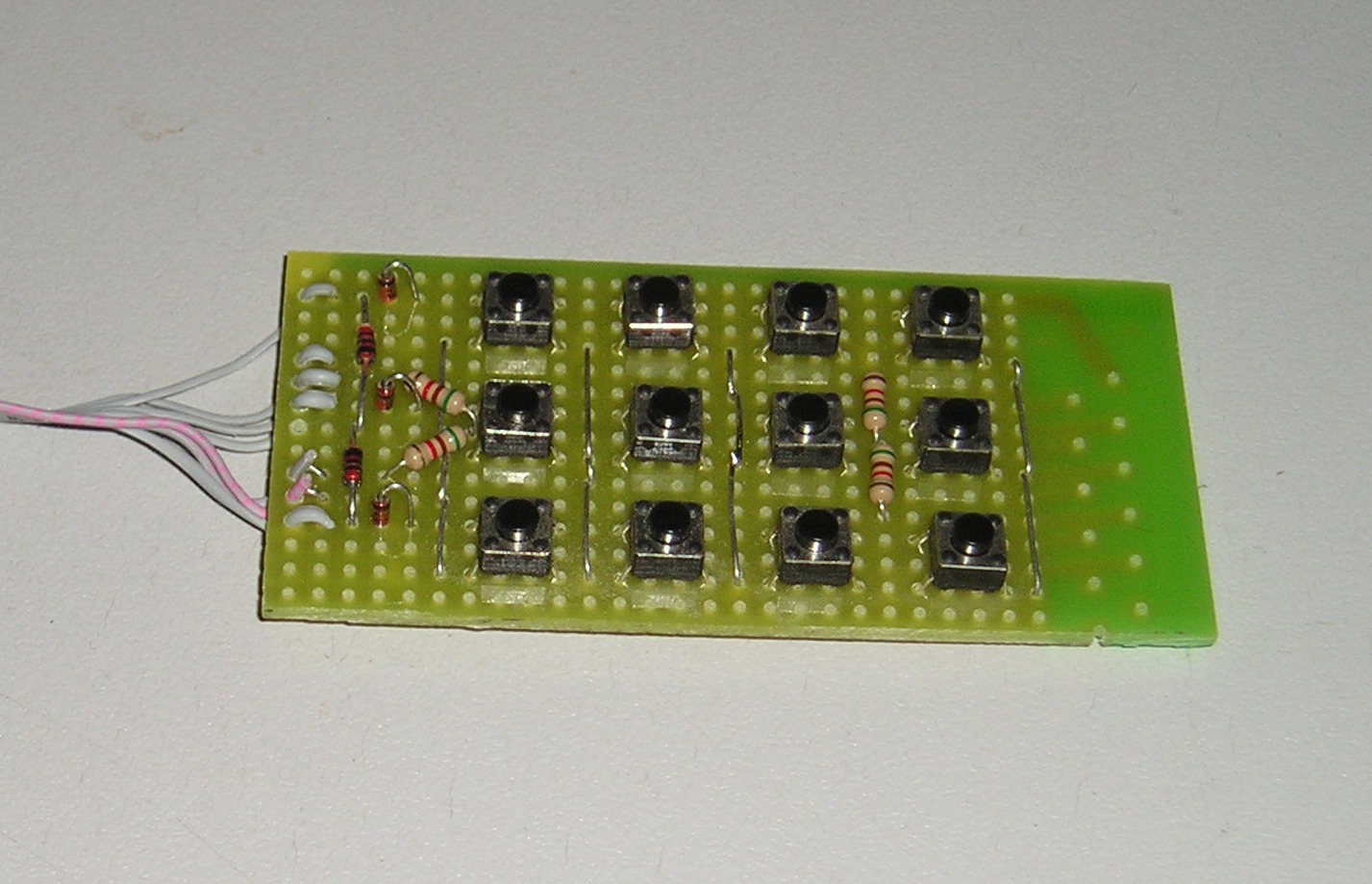 Клавиатура имеет до 12 кнопок, которые могут быть подключены при помощи hal-файлов конфигурации к любым сигналам в LCNC. Схема клавиатуры содержит 12 нормально разомкнутых кнопок, включенных в матрицу 3х4, 5-6 маломощных диодов (например КД521 или 1N4148) и 4 резистора на 3-6 кОм. Подключается семипроводным кабелем или шлейфом.