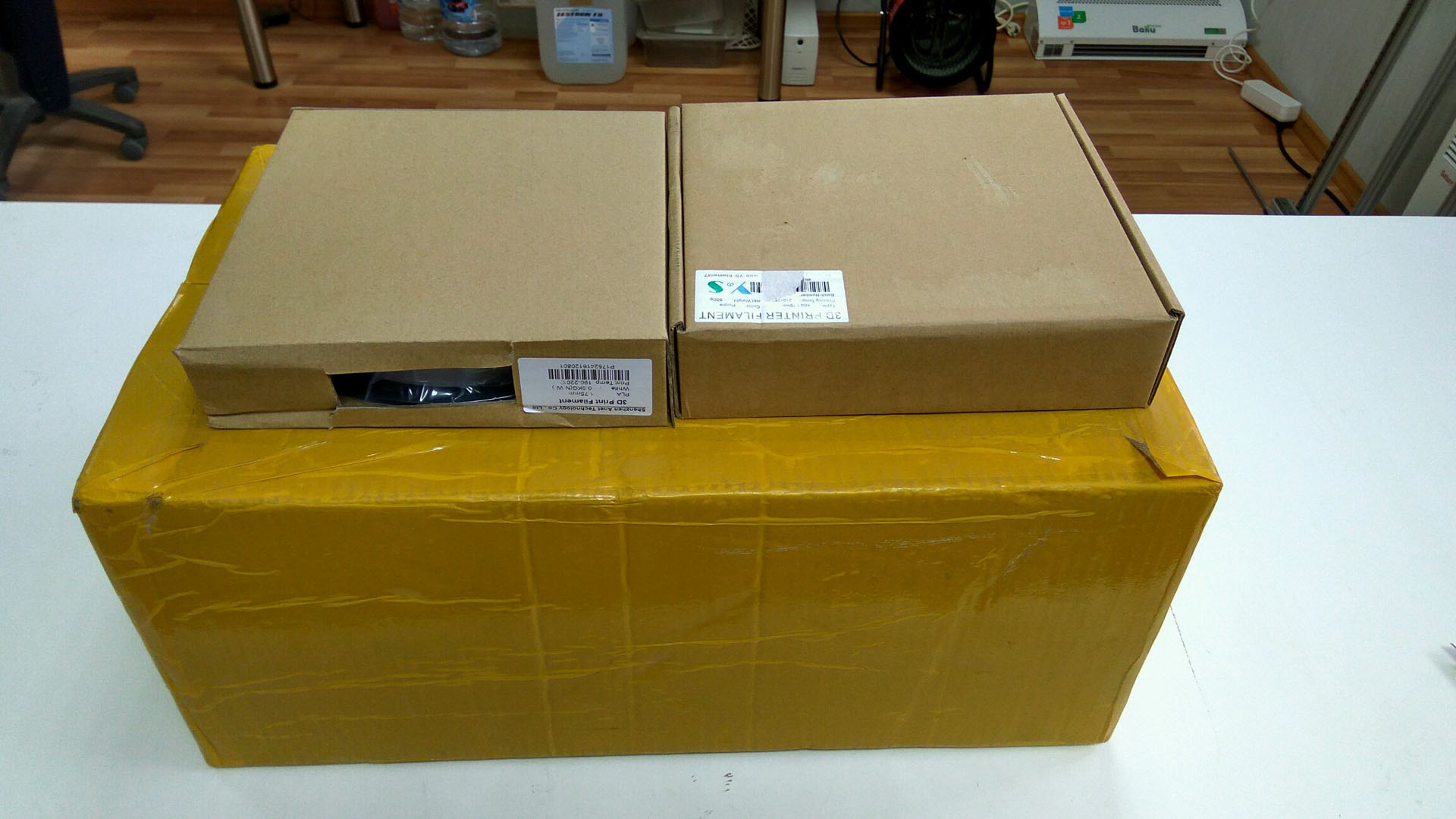 С двумя небольшими катушками пластика (0.5 кг PLA и 0.5 кг ABS):